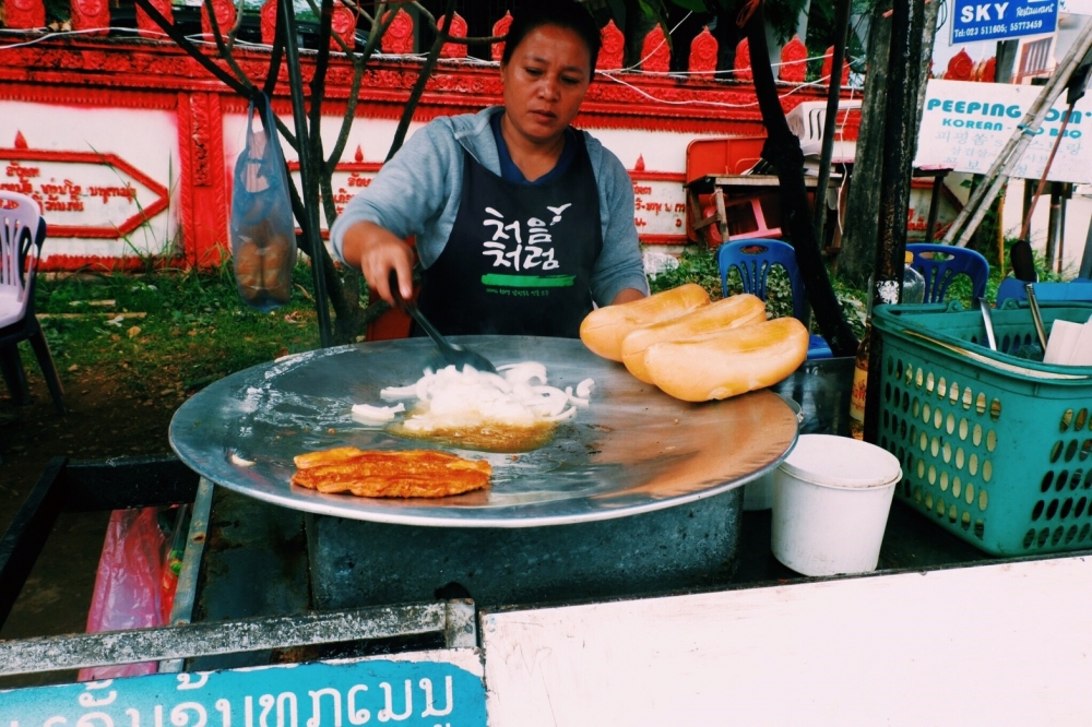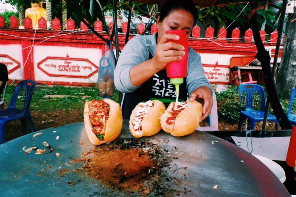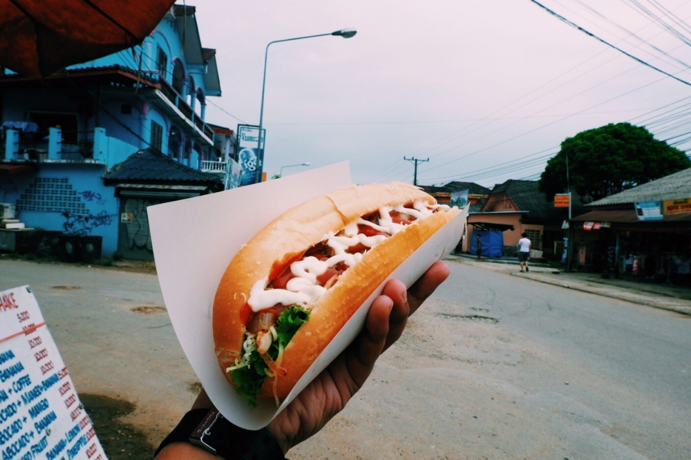 เราสั่งฮอทด๊อกไป (ที่ลาวเรียกแซนวิช) ราคาเริ่มต้นอยู่ที่ 15000 กีบ หรือ 60 บาทนั้นเอง