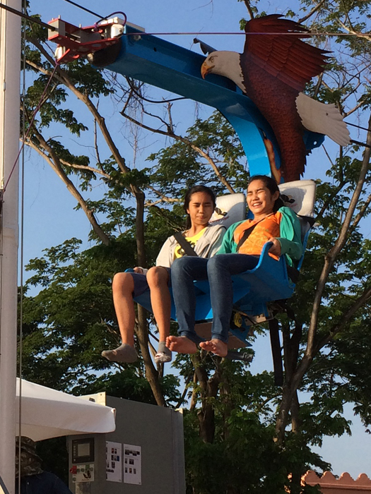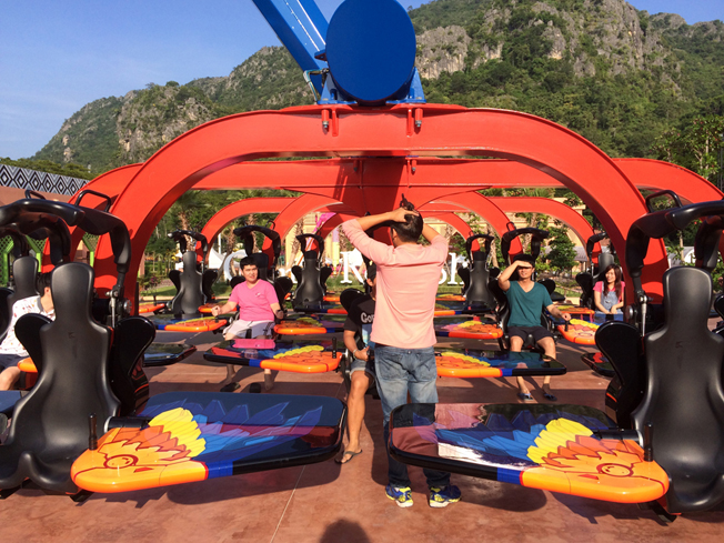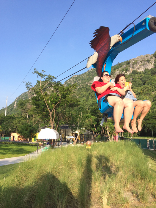 อันต่อมาเป็นเก้าอี้ที่อยู่บนสายเคเบิ้ล มีชื่อว่า อีเกิ้ล ซิปไลน์ (Eagle Zipline) เครื่องนี้ต่อคิวค่อนข้างยาวเพราะ เล่นได้ทีละ 2 คน เครื่องนี้พี่เค้าบอกนำเข้ามาจากอเมริกา เป็นเหมือนกระเช้าที่จะดึงเราขึ้นไปข้างบน แล้วก็ปล่อยลงมา ตามแรงโนมถ้วง ขึ้นไปครั้งแรกประทับใจมากๆ เห็นวิวท้งหมดเลย แถมสูงมากๆอีกด้วย เด็กๆก็เล่นได้ ถือว่าโอเคเลยครับ