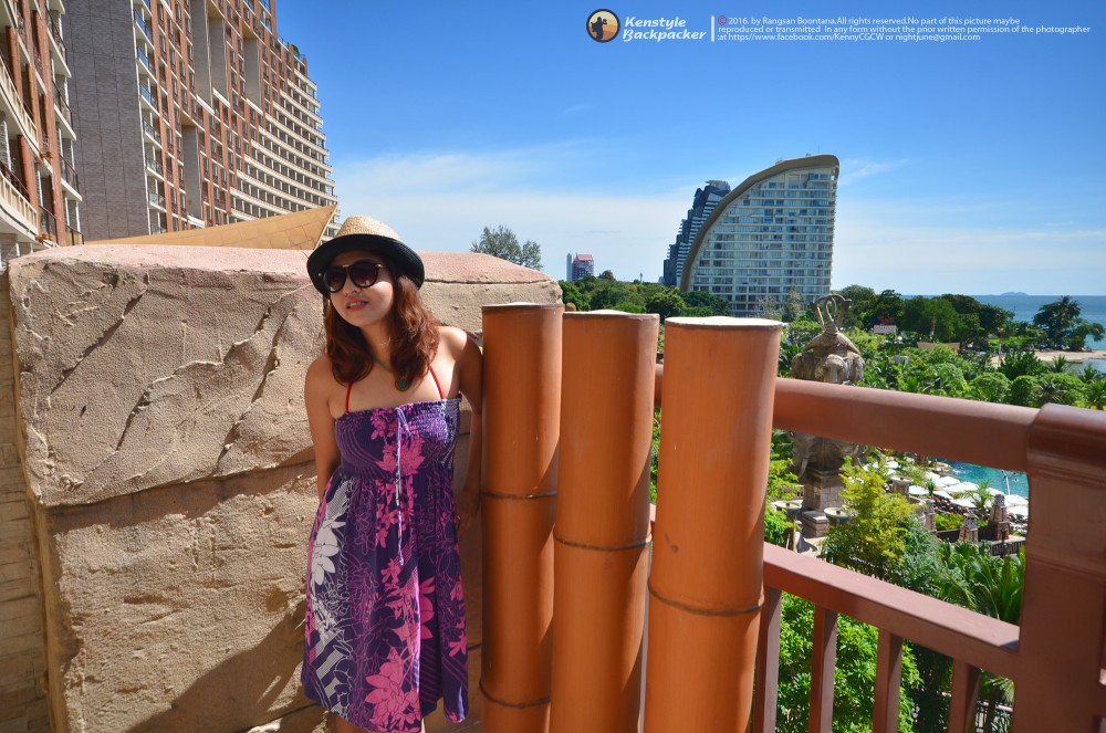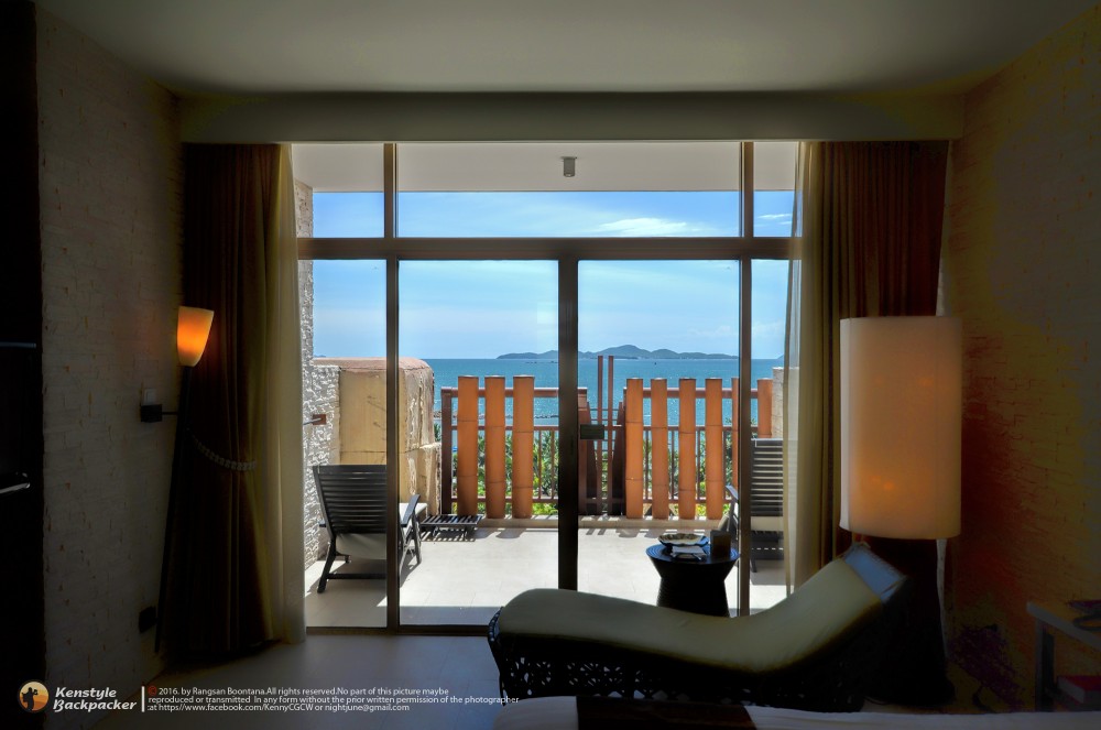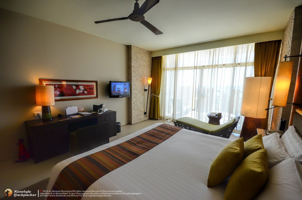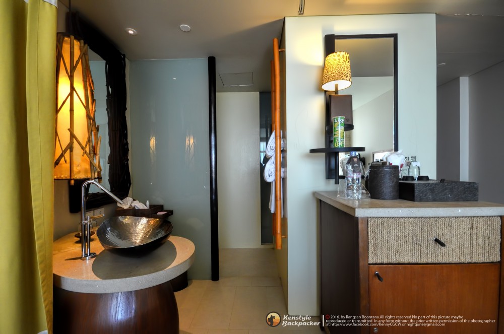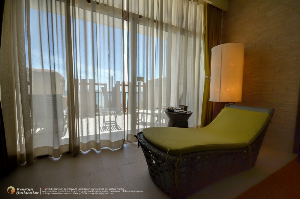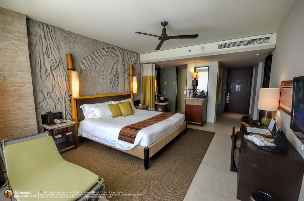 ภายใต้อุโมงค์ ด้านขวาจะเป็นห้องอาหารอะควา และ counter check in ผมจองห้อง deluxe ocean facing ไว้ จัดแจง check in เรียบร้อยขึ้น lift ไปยังห้องพักซึ่งอยู่ชั้น 3 ภายในห้องพักตกแต่งเป็นธีมซาฟารีโดยแท้ โทนสีของห้องเป็นโทนสีน้ำตาลดูอบอุ่น เตียงนอนออกแบบเหมือนเป็นเตียงไม้ไผ่ ผนังห้องเป็นภาพต้นไม้แกะสลักเป็นภาพนูนต่ำชิดไปยังผนังที่เป็นรูปแผ่นหิน โต๊ะเก้าอี้วัสดูเป็นไม้ มีโคมไฟให้แสง warm light ประดับตามมุมต่างๆ มีเก้าอี้นอนเล่นเล็กๆสำหรับเปลี่ยนบรรยากาศ ตัวห้องน้ำแยกออกเป็นห้องอาบน้ำและห้องส้วมคนละห้อง วัสดุที่ใช้ตกแต่งภายในห้องพักดูเรียบง่ายกลมกลืนกับธีมที่เป็นธรรมชาติดี