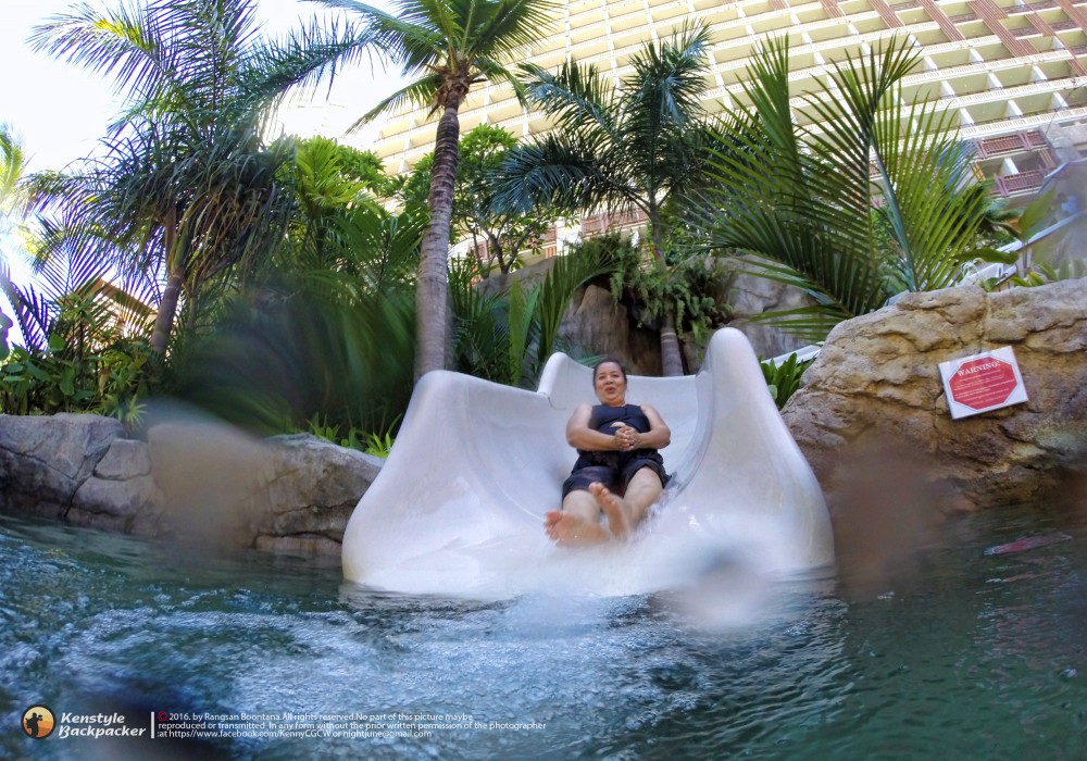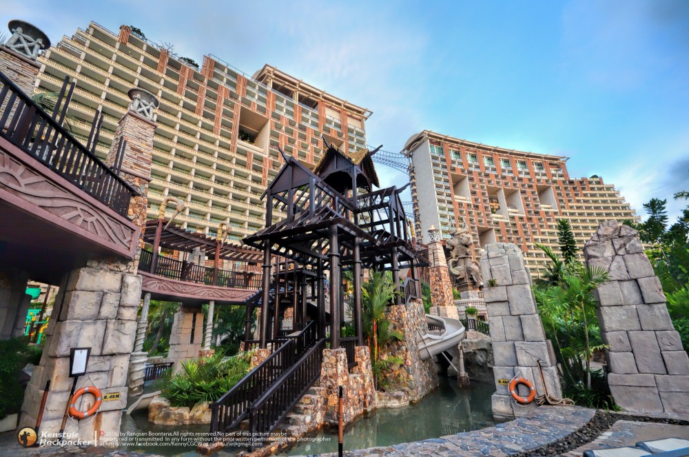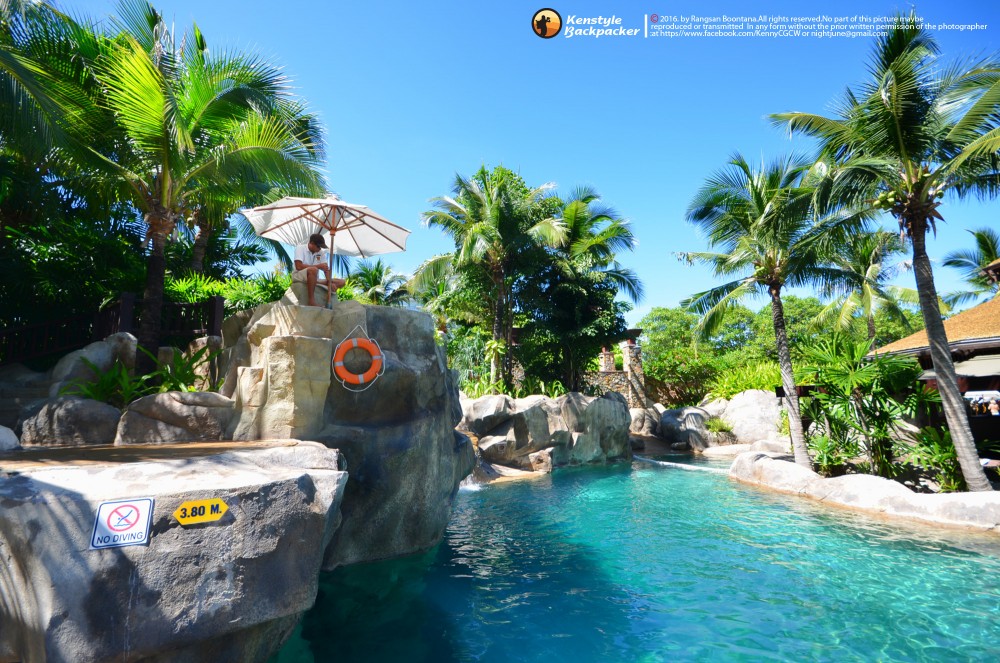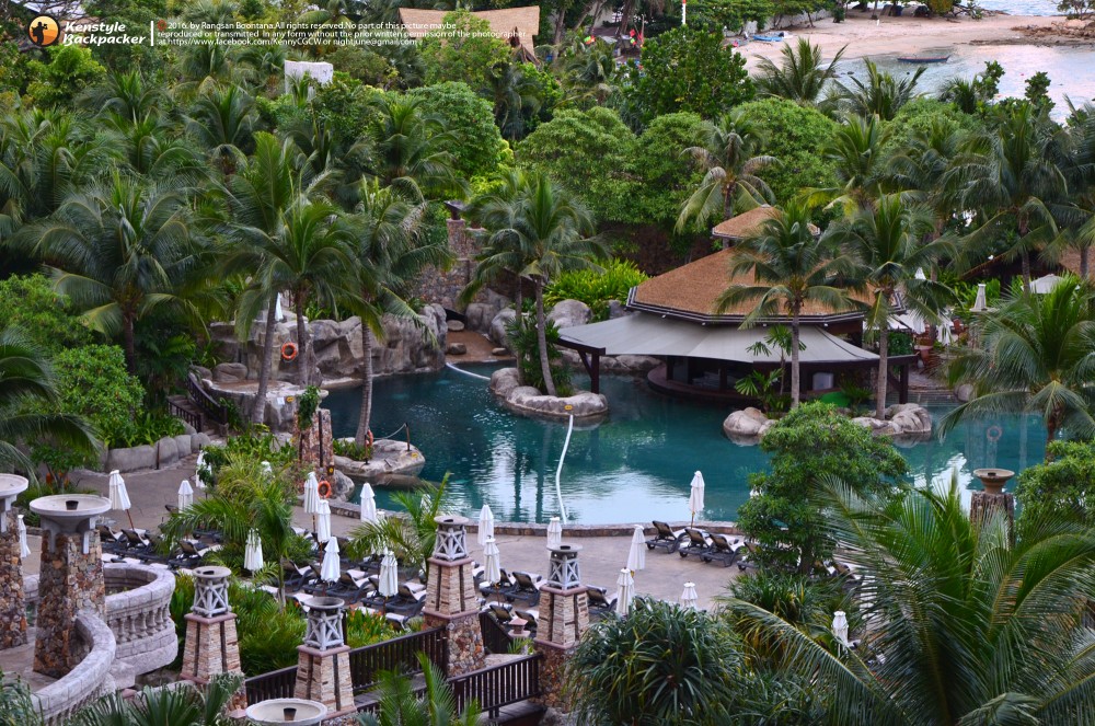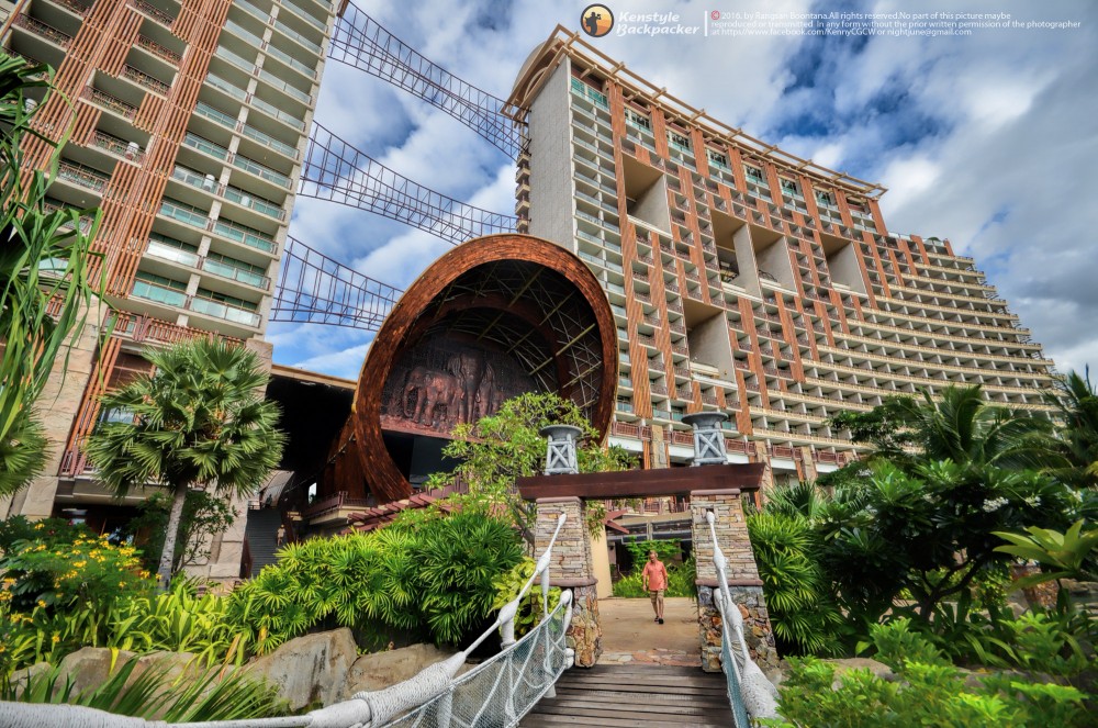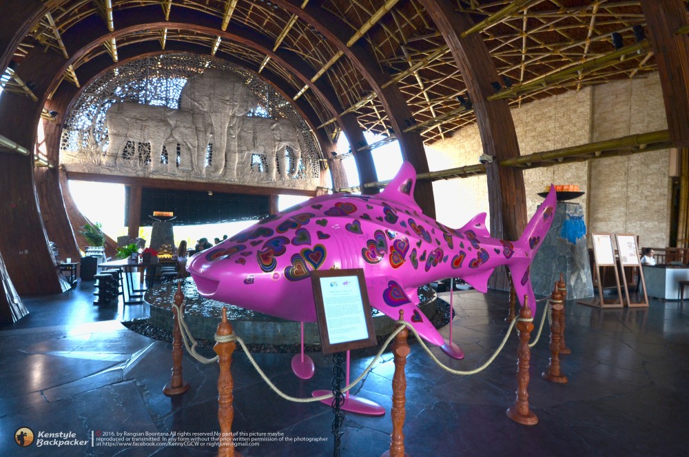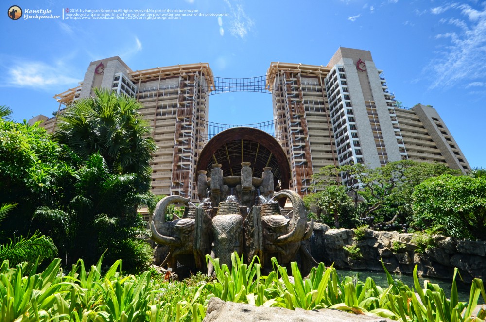 ภายใต้อุโมงค์ ด้านขวาจะเป็นห้องอาหารอะควา และ counter check in ผมจองห้อง deluxe ocean facing ไว้ จัดแจง check in เรียบร้อยขึ้น lift ไปยังห้องพักซึ่งอยู่ชั้น 3 ภายในห้องพักตกแต่งเป็นธีมซาฟารีโดยแท้ โทนสีของห้องเป็นโทนสีน้ำตาลดูอบอุ่น เตียงนอนออกแบบเหมือนเป็นเตียงไม้ไผ่ ผนังห้องเป็นภาพต้นไม้แกะสลักเป็นภาพนูนต่ำชิดไปยังผนังที่เป็นรูปแผ่นหิน โต๊ะเก้าอี้วัสดูเป็นไม้ มีโคมไฟให้แสง warm light ประดับตามมุมต่างๆ มีเก้าอี้นอนเล่นเล็กๆสำหรับเปลี่ยนบรรยากาศ ตัวห้องน้ำแยกออกเป็นห้องอาบน้ำและห้องส้วมคนละห้อง วัสดุที่ใช้ตกแต่งภายในห้องพักดูเรียบง่ายกลมกลืนกับธีมที่เป็นธรรมชาติดี