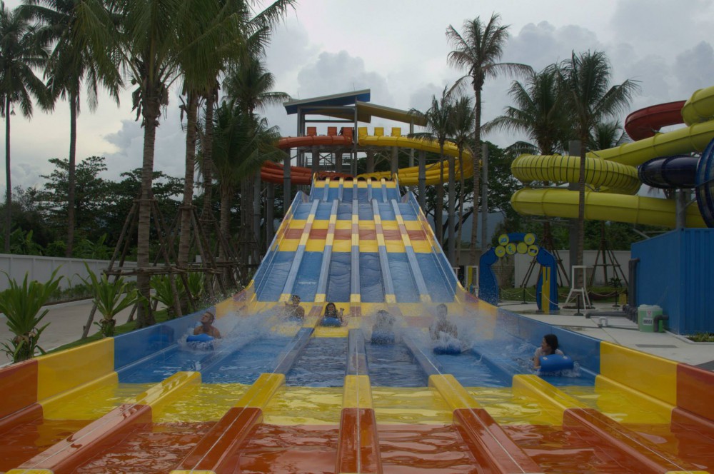 ถัดมาเป็นสไลเดอร์สีแดงที่ Tower 2 ครับ ซึ่งจะชันกว่าสไลเดอร์สีเหลืองอยู่นิดหน่อย แต่ด้วยความที่เป็นสไลเดอร์แบบเปิดโล่ง เลยรู้สึกเสียวธรรมดา เฉยๆหลังจากเล่นสีเหลืองมาครับ อันนี้เป็นอันสุดท้ายที่ต้องเล่นห่วงยางสองคนครับ