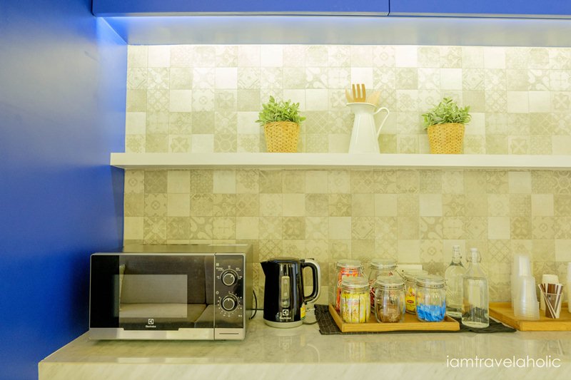 ด้านในมีไมโครเวฟ น้ำร้อน กาแฟ ชา โอวัลติน จาน ชาม ช้อน ส้อม ไว้บริการ