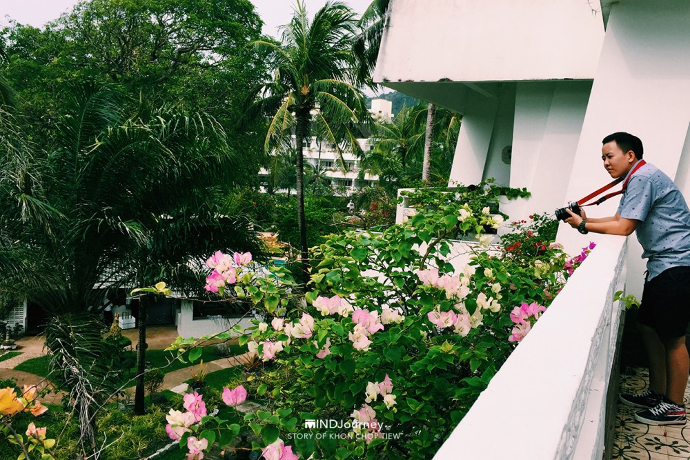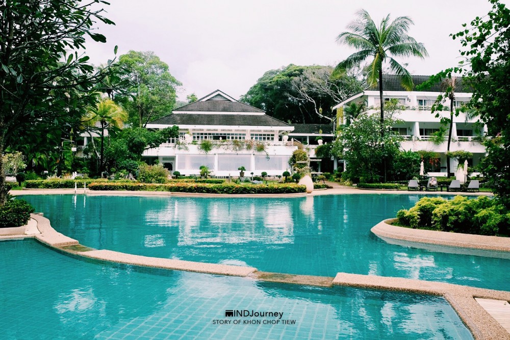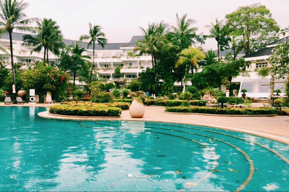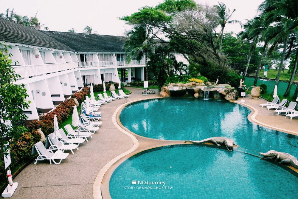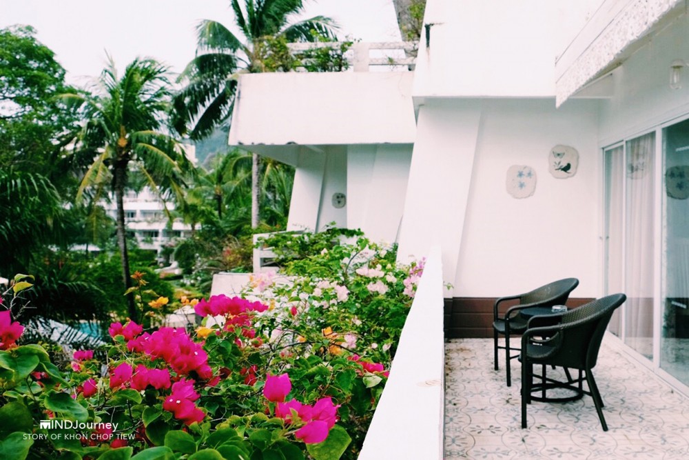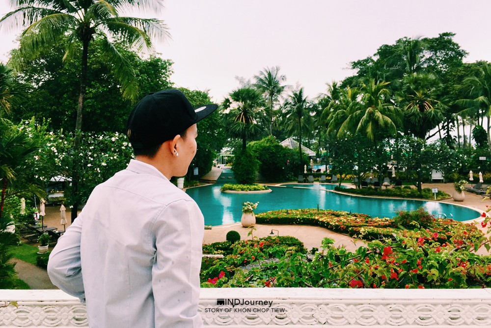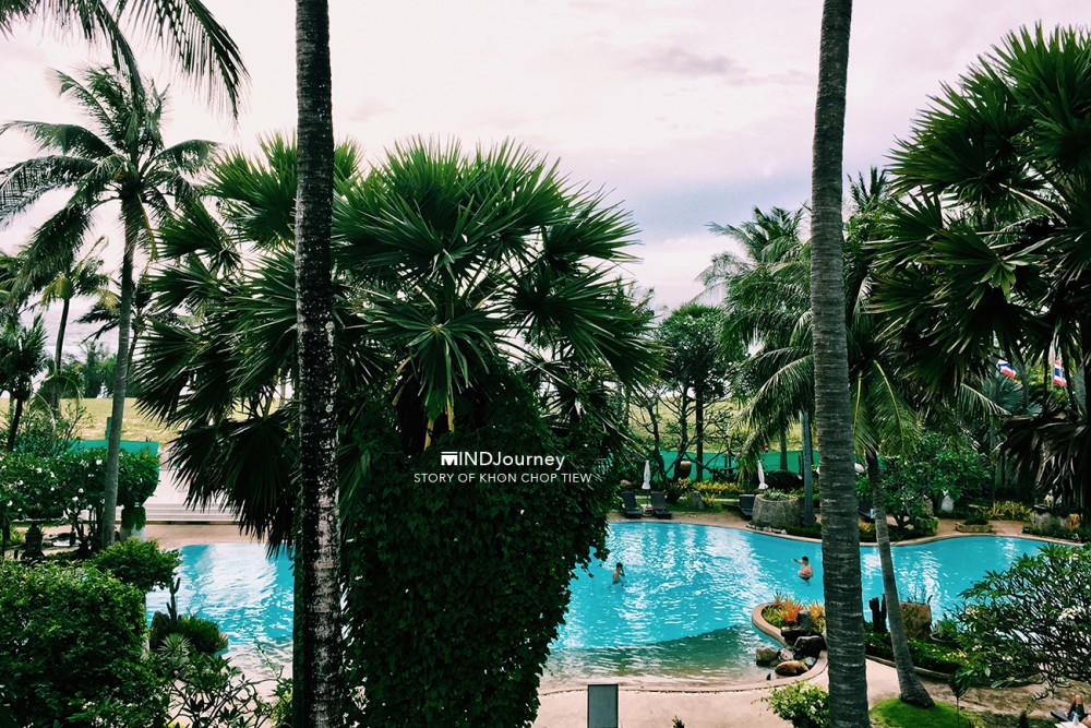 ...ตรงปลายสายตาที่เห็นไกลออกไป เป็น 'คลื่นน้ำ' วอบแวมจากมุมซ้ายของระเบียงห้องพัก ส่วนทัศนียภาพข้างล่างจะเป็นสวนกับวิวสระ ดูเหอะ ทิวทัศน์ข้างล่างนั่น...เหมือนกำลังกวักมือหยอย ๆ เรียกเราให้เข้าไปใกล้อีกนิด