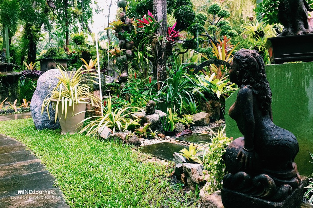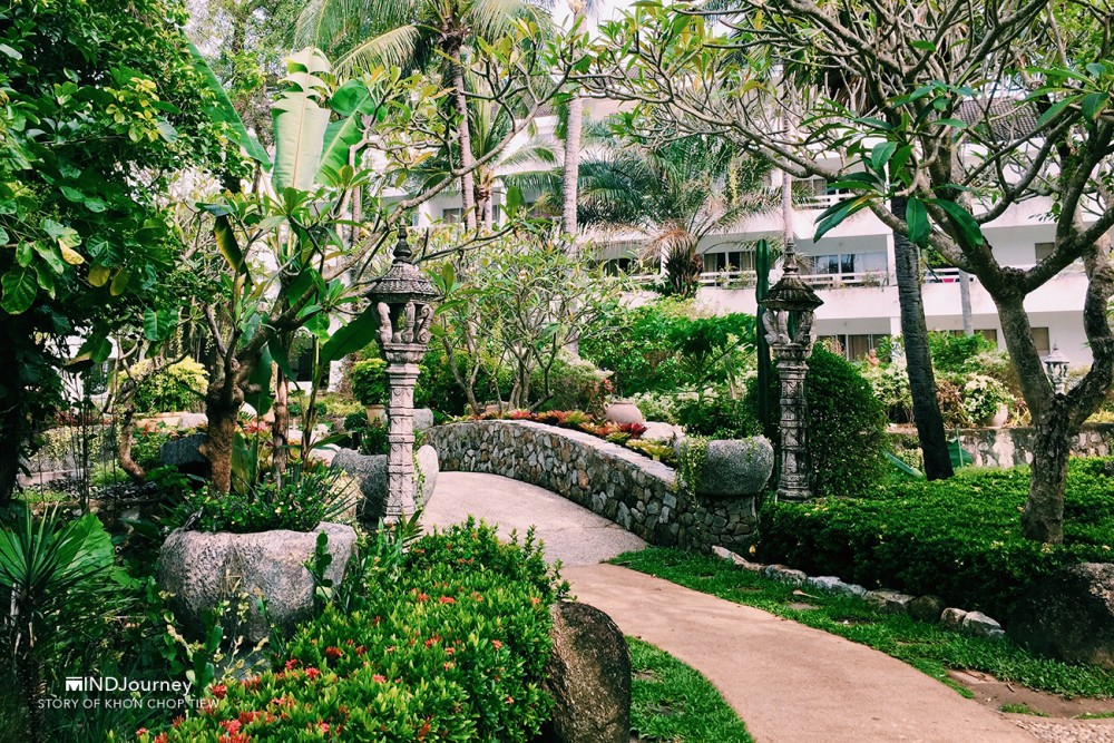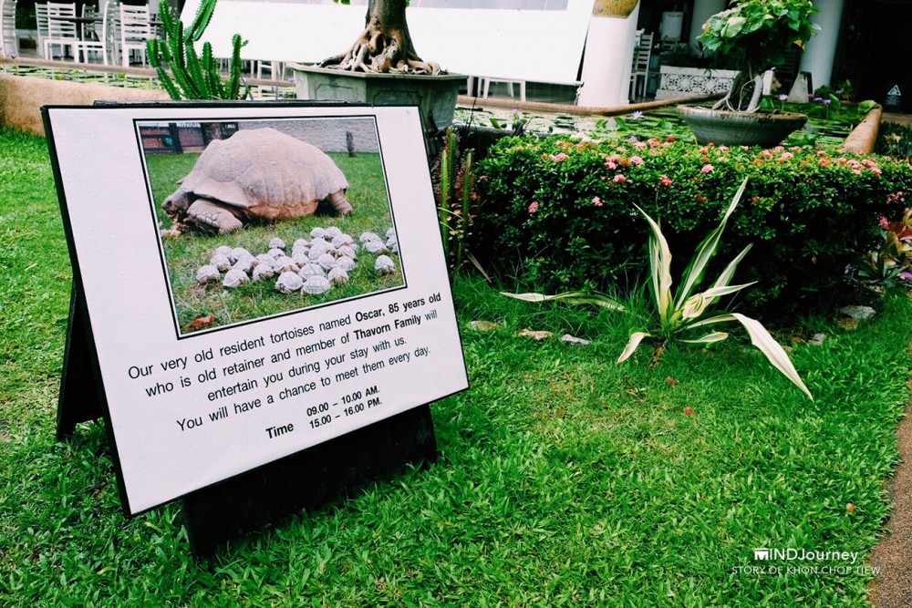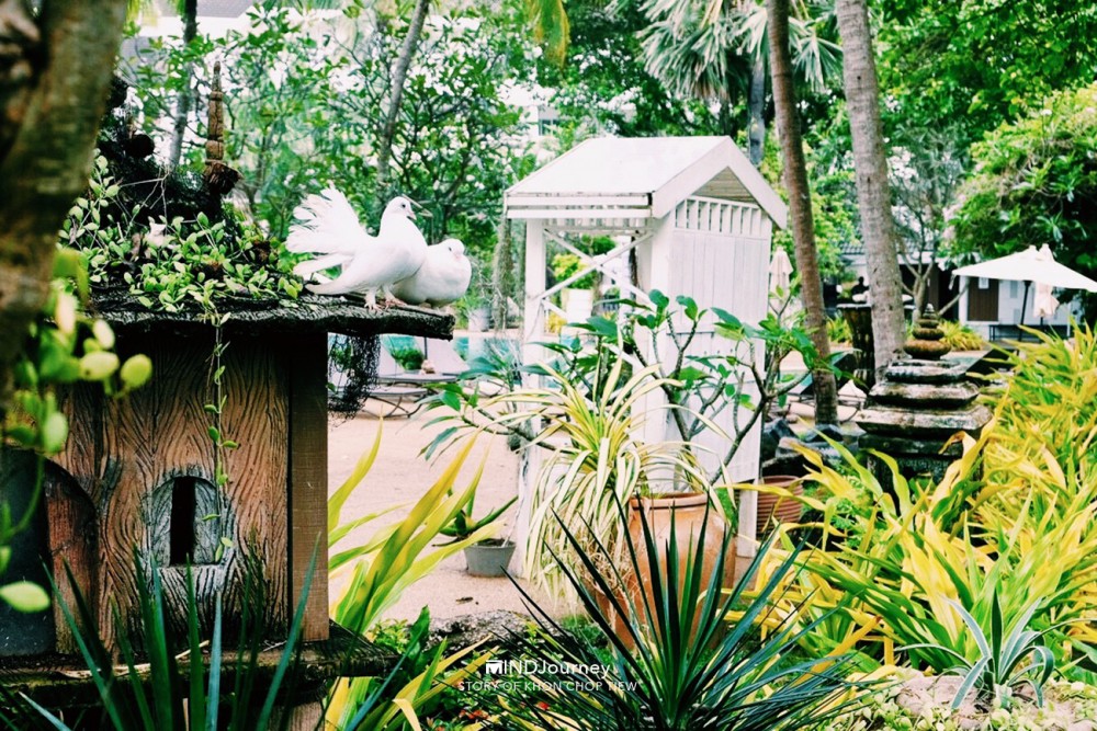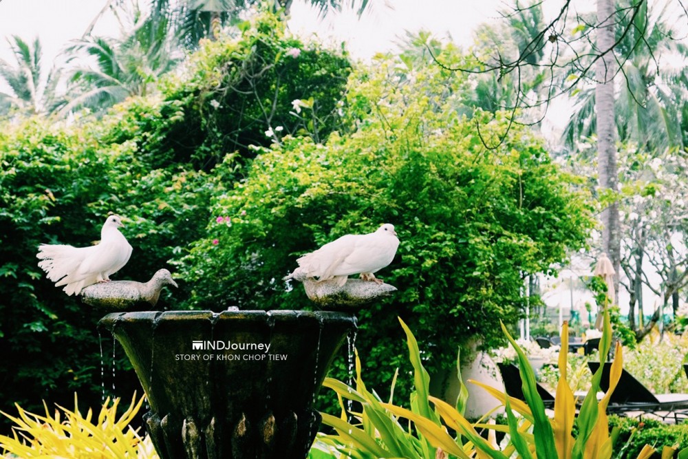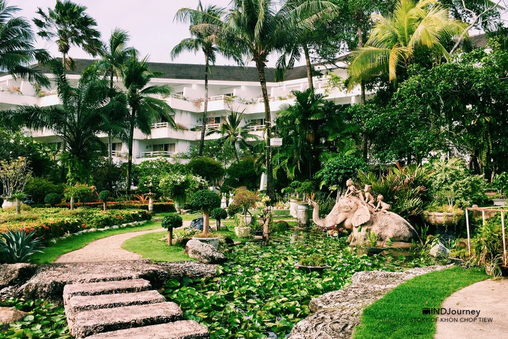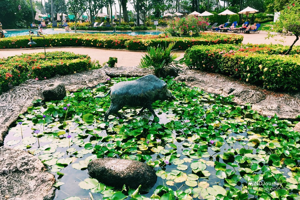 ที่นี่...ต้นไม้บางต้น ก้อนหินบางก้อนอยู่คู่โรงแรมมาตั้งแต่ช่วงแรก ๆ บริเวณโดยรอบอุดมไปด้วยต้นไม้ดอกไม้เสียเป็นส่วนใหญ่ บางจุดแทรกไว้ด้วยบัวในบึงน้ำที่กำลังงาม ชูก้านอวดดอกสวย และตกแต่งสวนด้วยงานปั้นสีขาวรูปสัตว์ชนิดต่าง ๆ