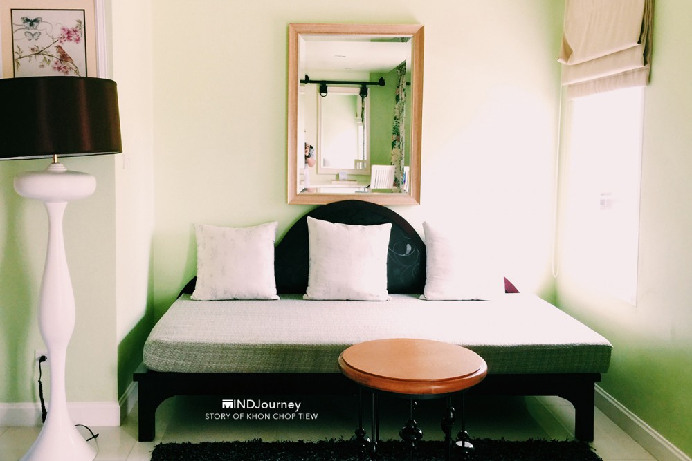 ~ ตรงมุมซ้ายด้านในสุดของห้อง จัดเป็นมุมนั่งเล่นขนาดกะทัดรัดพร้อมเดย์เบดนั่งสบาย นอกจากนี้มีบริการ Free Wifiและ Smart TV ภายในห้องด้วยค่ะ