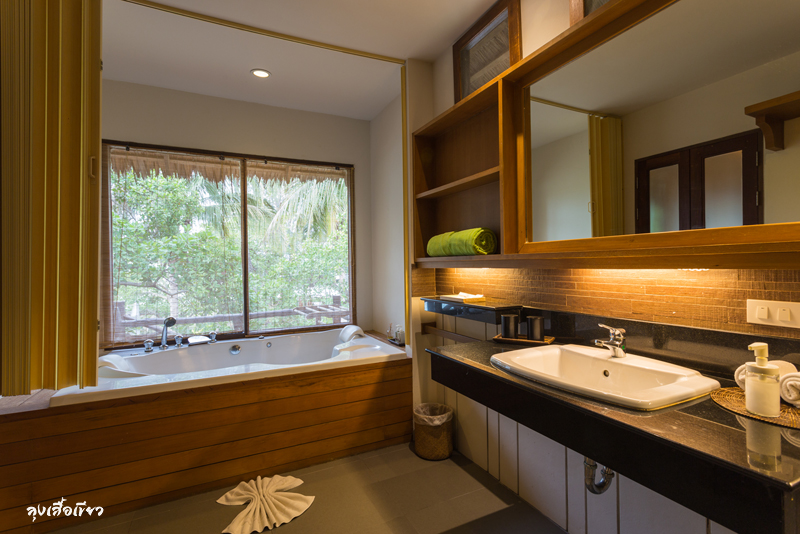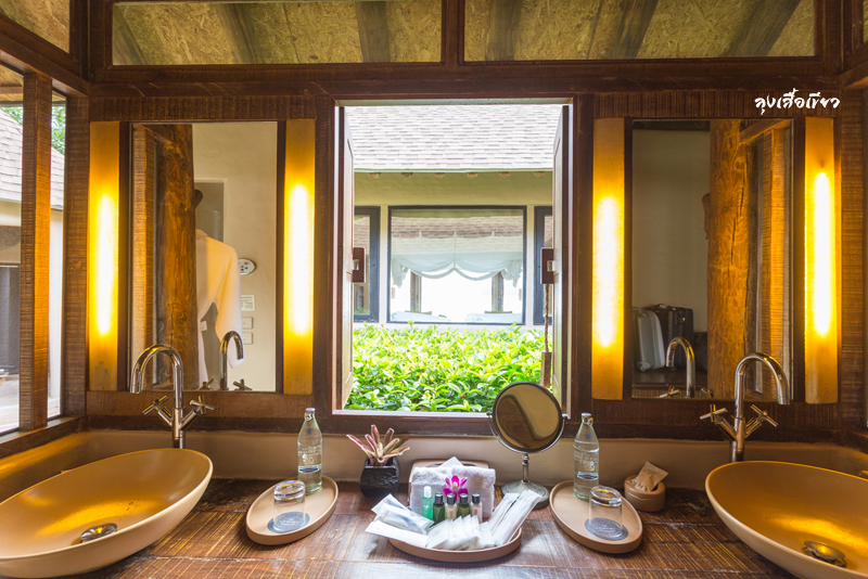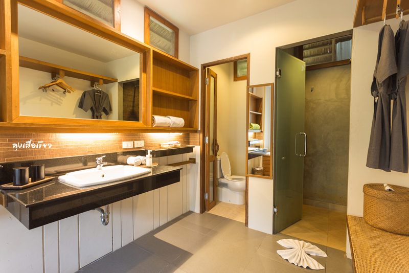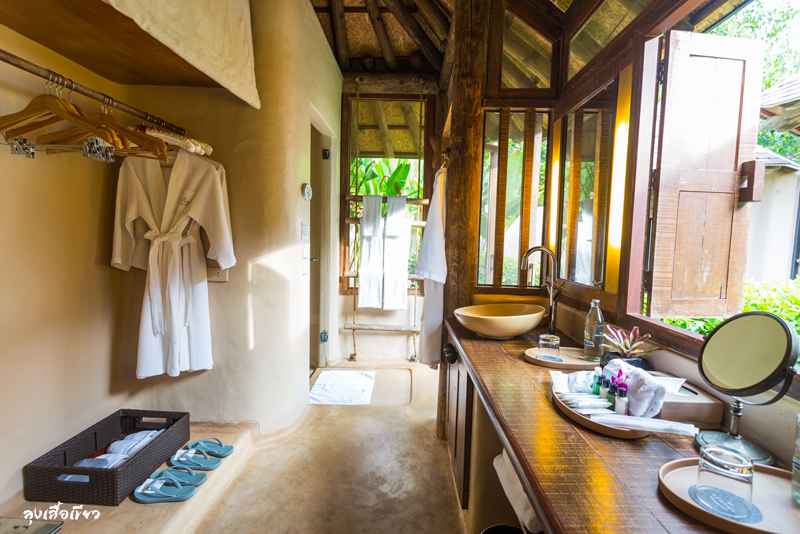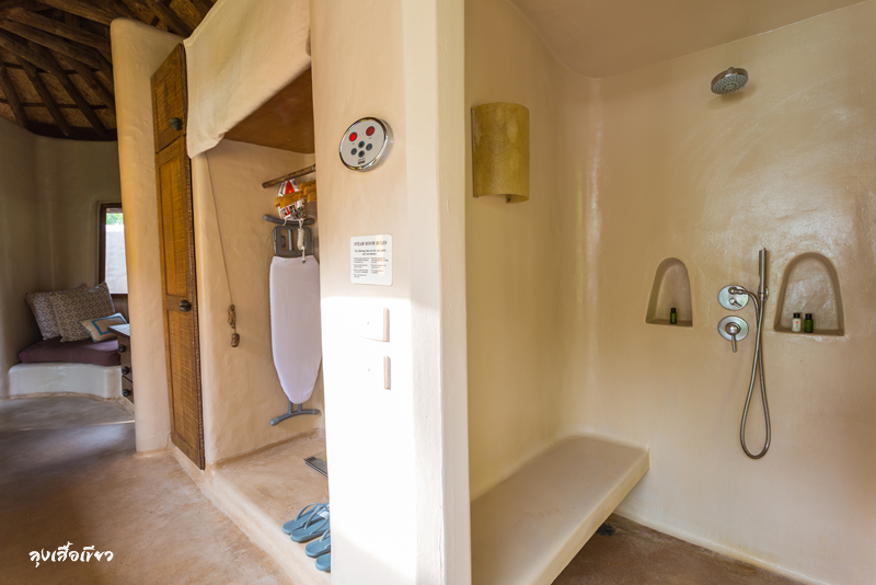 จากพื้นที่ห้องนอนจะมีทางเดินเชื่อมไปยังพื้นที่ของห้องน้ำและห้องแต่งตัว พื้นที่ในส่วนนี้จะเป็นแบบ Open Air มีพัดลมติดผนังช่วยระบายความร้อน ห้องน้ำแยกส่วนเปียกส่วนแห้งออกจากกันอย่างชัดเจน โดยมีตู้เสื้อผ้าและอ่างล้างหน้าคั่นกลาง อุปกรณ์อำนวยความสะดวกในส่วนนี้ก็ค่อนข้างครบครันเลยครับ มีทั้งเตารีด ที่รองรีด ที่ชั่งน้ำหนัก เสื้อคลุมอาบน้ำ รองเท้าใส่เดินใน Villa และที่เก๋กู๊ดมากๆ เห็นจะเป็นห้องอาบน้ำ ที่เป็นห้อง Stream ในตัวด้วยครับ เนื่องจากการใช้น้ำจืดบนเกาะต้องอาศัยน้ำบาดาลที่สูบขึ้นจากกลางทะเล ทำให้เวลาอาบน้ำแล้วอาจสัมผัสได้ถึงความเค็มๆ ปลายๆ จากละอองน้ำอยู่บ้างครับ