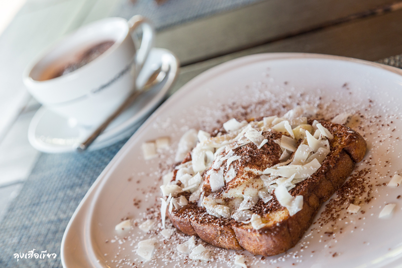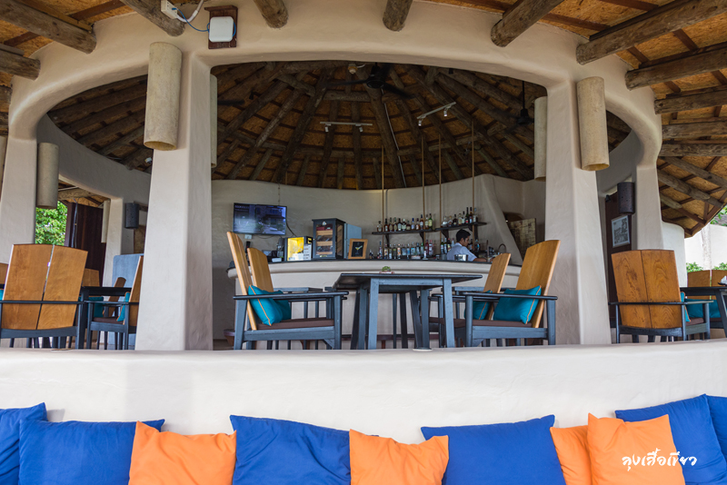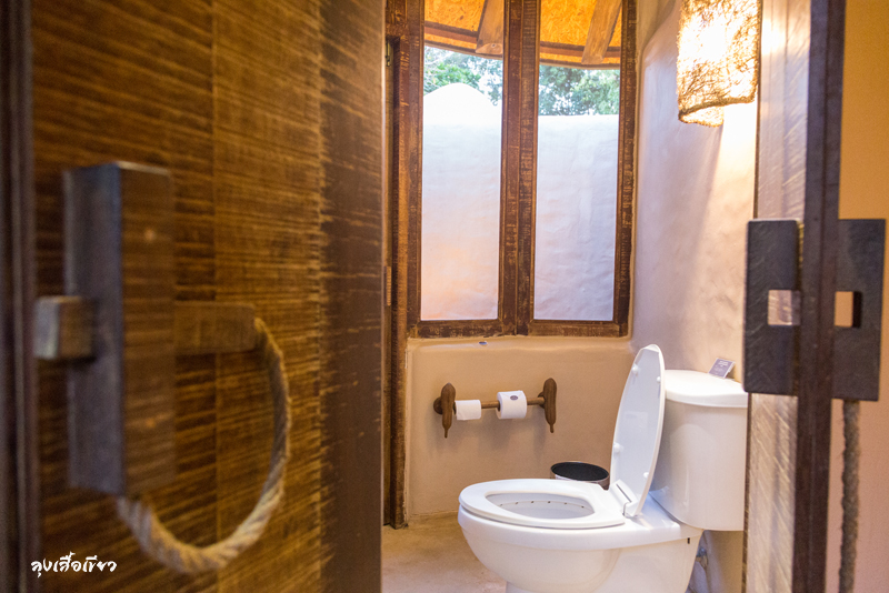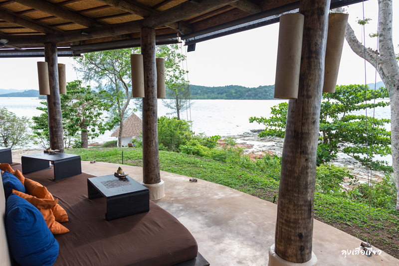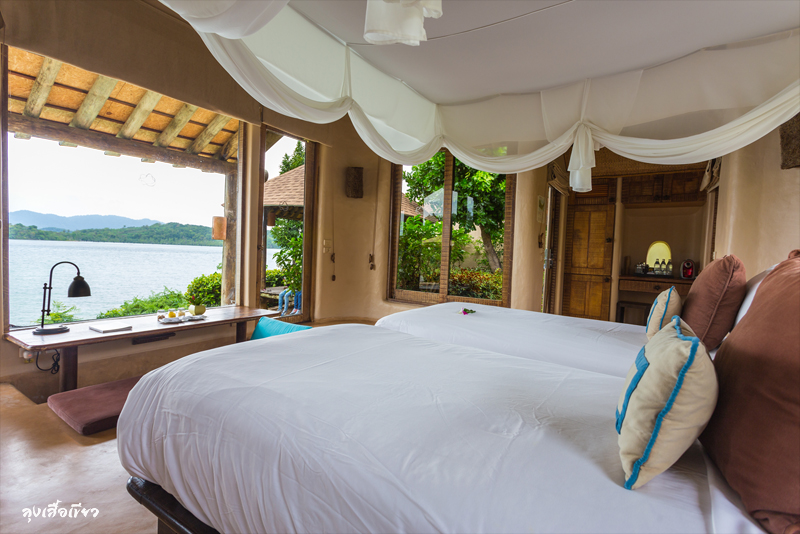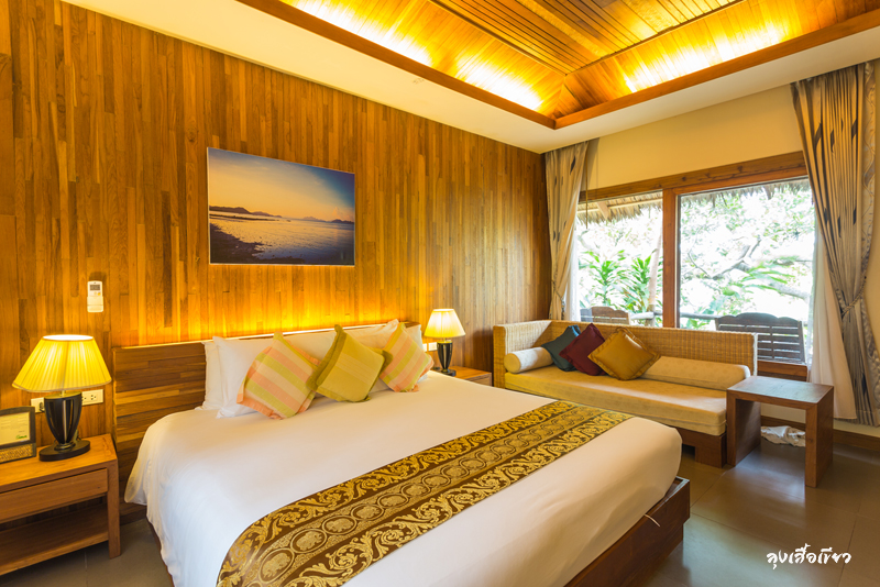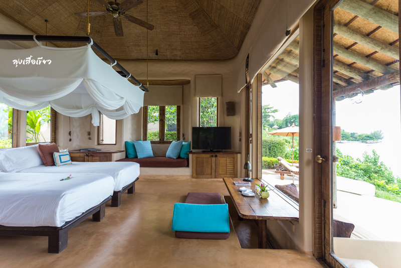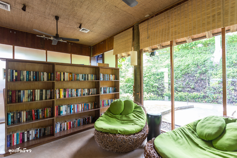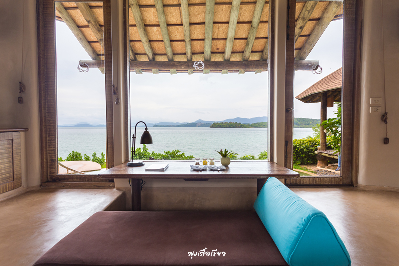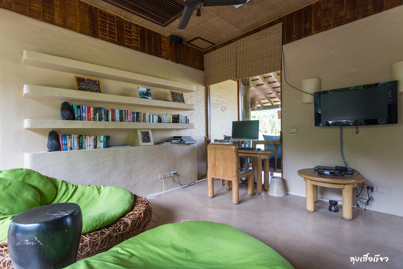 นอกจากนี้บริเวณปลายเตียง ยังมีมุมให้นั่งอ่านหนังสือ จะนั่งห้อยขาอ่านหนังสือหรือจะนั่งชมวิวด้านนอกห้องก็ได้ หากใครเมื่อยล้าก็สามารถนอนเอกเขนกดูทีวีบนเบาะนุ่มๆ พร้อมทานขนมขบเคี้ยวที่ทางรีสอร์ทได้จัดเตรียมไว้ให้บนโต๊ะ มีทั้งคุกกี้ สัปปะรดแห้ง และมะพร้าวอบแห้ง อร่อยเชียวครับ