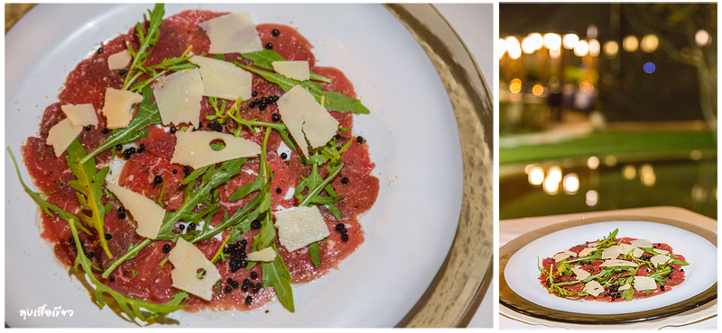 ตามมาด้วย Appertizers เริ่มที่ Seared Tuna กับซอส Chimichurri และ Wasabi Mayonaise เสิร์ฟบนแตงโมหั่นชิ้นลูกเต๋าและโรยหน้ามาด้วยไข่ปลาคาเวียร์