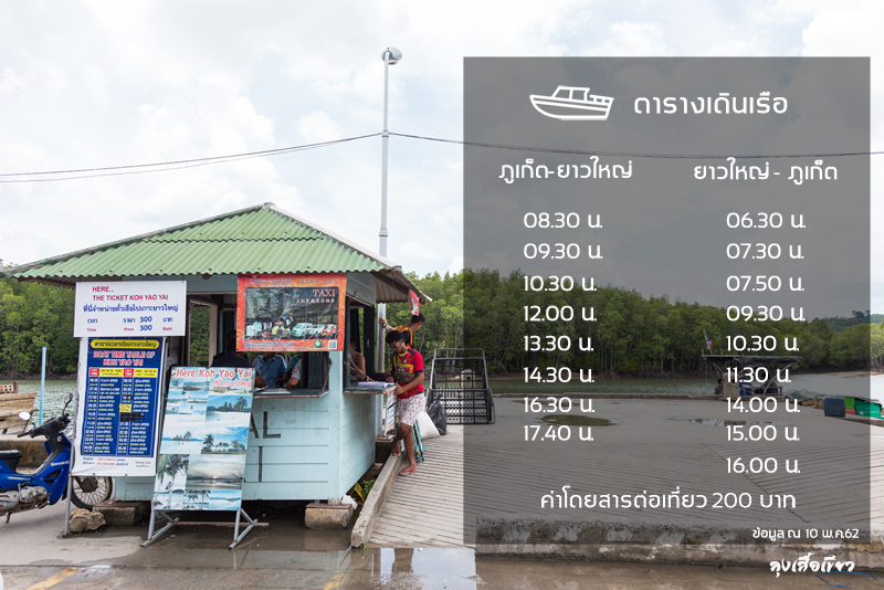 เมื่อหันหน้าเข้าสู่ท่าเรือ จุดจำหน่ายตั๋วไปยังเกาะยาวใหญ่ จะอยู่ทางด้านซ้ายมือ ค่าโดยสารคนละ 200 บาท (พิมพ์ไม่ผิดครับ ค่าโดยสาร 200 บาท แต่ที่ป้ายแสดงราคาตรงจุดจำหน่ายตั๋วเขียนว่า 300 บาท) ส่วนจุดจำหน่ายตั๋วไปยังเกาะยาวน้อย จะอยู่ทางด้านขวามือ ทั้งสองจุดตั้งอยู่ตรงข้ามกันครับ