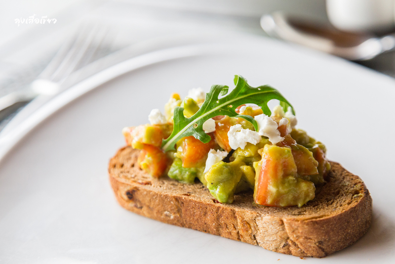 Toasted Sour Dough เป็นขนมปังที่เสิร์ฟมาพร้อมกับมะเขือเทศ อโวคาโด และ Goats Cheese