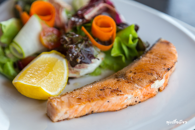 เริ่มที่ Grilled Salmon เสิร์ฟพร้อมสลัดผักสดๆ ครับ