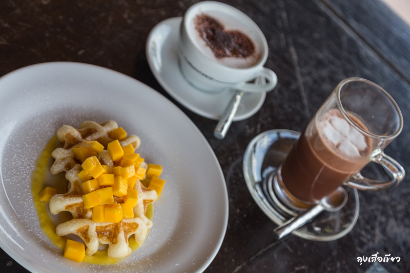 Waffles เสิร์ฟพร้อมมะม่วงสดและ Mango Mouse