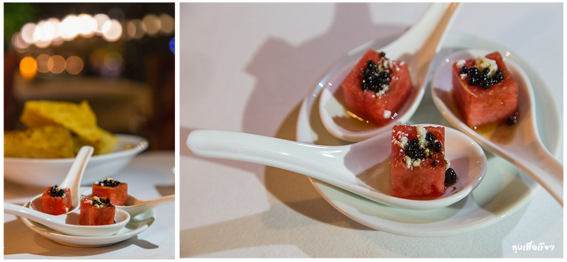 เริ่มด้วย Starter เป็นแตงโมหั่นเป็นชิ้นลูกเต๋าพอดีคำ โรยหน้าด้วยไข่ปลาคาเวียร์ครับ