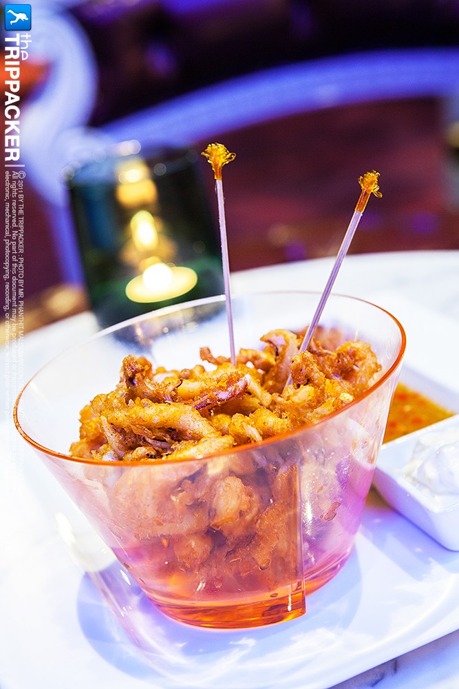 ผ่านเครื่องดื่มแก้วแรกไปแล้ว ทีนี้เราขอเอาใจสาวๆ ที่หลงใหลเครื่องดื่มสีสวยๆ กันด้วย “Senor Rita” เพราะแค่ชื่อก็บ่งบอกอยู่แล้ว ยิ่งถ้าเปรียบเครื่องดื่มแก้วนี้เป็นสาวๆ ก็คงเป็นสาวเปรี้ยว แต่แอบซ่อนความหวานไว้นิดๆ แล้วตัดความเปรี้ยวเข็ดฟันไว้ด้วยเกลือบางๆ ที่ปากแก้ว เชื่อว่าใครได้ดื่มเป็นต้องถูกใจ ระหว่างที่ได้จิบแอลกอฮอล์กันไปเบาๆ แล้ว เรายังมีเมนูอาหารว่างง่ายๆ ไว้ให้กินด้วย คืนนี้จะได้นั่งเล่นกันได้ยาวๆ หน่อย เริ่มกันที่ “Samosa Sextet” สีเหลืองนวลชวนน้ำลายไหล ตัวแป้งกรอบๆ ห่อไส้ผักไว้เต็มคำ เสิร์ฟพร้อมซอส 2 รส 2 สไตล์ ใครชอบรสหวานหน่อย แนะนำให้จิ้มซอสมะม่วง แต่ถ้าใครอยากได้รสมันๆ ซ่าๆ ให้กินคู่กับซอสมินท์โยเกิร์ตรับรองจะติดใจ ส่วนอีกหนึ่งเมนูกินเล่นที่เราเลือกมาแนะนำกันในคราวนี้ก็คือ “Golden Calamari” ปลาหมึกหั่นเป็นเส้นก่อนนำไปชุปแป้งทอดจนกรอบได้ที่ ทำเอาเราเคี้ยวเพลินจนลืมใส่ใจเรื่องคอเรสเตอรอลไปเลย นอกจากนี้ทางร้านยังแอบแนะนำ Cocktail สูตรพิเศษอีกแก้วที่ถูกใจบรรดาสาวๆ เป็นที่สุด อย่าง “Mos Eisley Cantina Concoction” เครื่องดื่มสีฟ้าสดใสแก้วนี้ ดื่มง่าย หวาน มัน จึงไม่น่าแปลกใจที่คุณสาวๆ จะชอบกันมาก