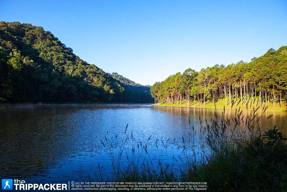 ไฮไลท์ : แสงสีทองตอนเช้าที่ส่องลงมากระทบผิวน้ำ และมีไอหมอกลอยระเรี่ยผิวน้ำ