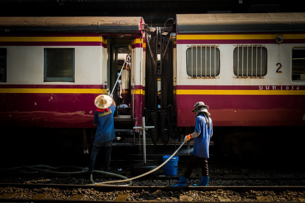 เวลารถไฟมาเทียบชานชาลาก็จะมีเจ้าหน้าที่ล้างทำความสะอาดครับ มันก็ดูสะอาดขึ้นมาบ้างนิดหน่อย