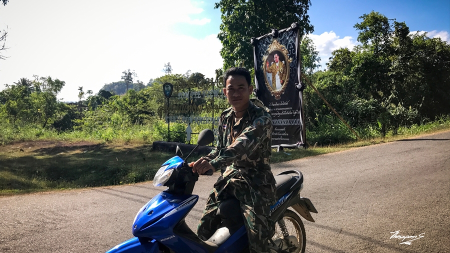 ผมก็เดินเอาเบาะรองนอนไปคืนกลับเจ้าหน้าที่ และรอรับบัตรประชาชนคืน ประมาณ 09.00 น. ระหว่างนั้นผมก็พูดคุยกับเจ้าหน้าที่อีกครั้ง หรือจะเรียกว่าอ้อนวอนก็ได้ว่าขอขึ้นเขาสันหนอกวัวได้ไหม ฮ่าๆๆๆ วันนี้มีคนสละสิทธิ์ไหม ผมจะขอขึ้นแทน แต่ก็ไม่มีผลเหมือนเดิม แป่ววว ไม่เป็นไรครับ ผมขอบคุณเจ้าหน้าที่ แทบทุกคนที่เดินผ่าน ทุกคนเป็นกันเองมากคับ แล้วผมก็เดินออกจากจุดชมวิวป้อมปี่ เดินไปสักแปป พี่เจ้าหน้าที่ขี่รถมอเตอร์ไซด์มาพอดีเลยรับผมไปส่งปากทางเข้าเหมือนเดิม สบายอีกแล้ว พอลงรถพี่เขาถามว่าไปไหนต่อ ผมบอกไปสะพาญมอญครับ พี่เขาเลยแนะนำว่าให้โบกรถนักท่องเที่ยวไปด้วยเลย รอเมล์แดงมันจะนาน ผมเลยขอบคุณพี่เขาอีกรอบ และถ่ายรูปไว้อีกหนึ่งแชะ