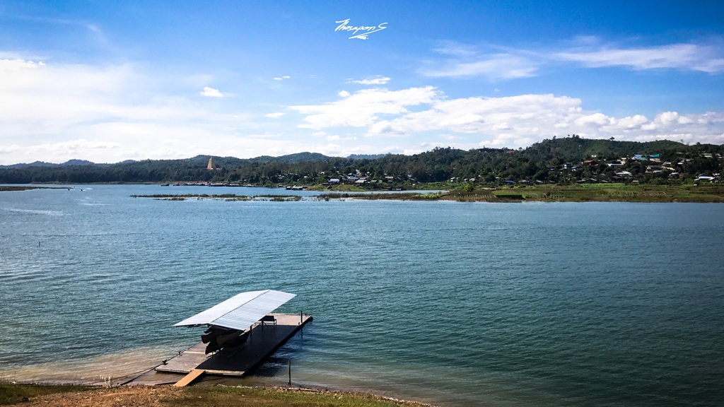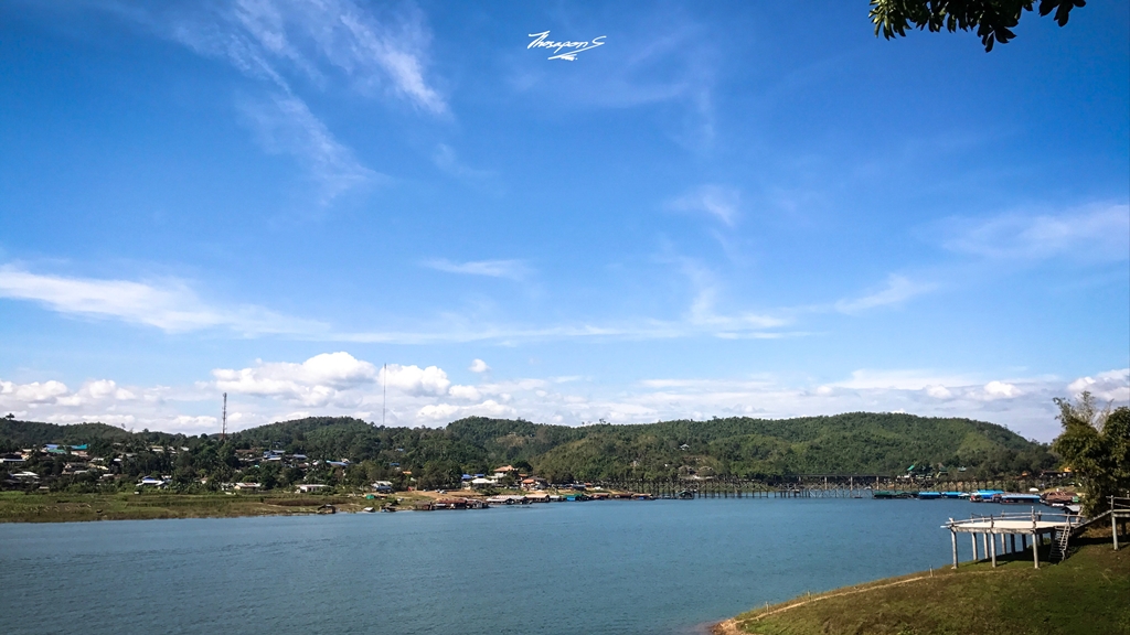 หลังจากขึ้นรถแล้ว ในที่สุดผมก็มาถึงอำเภอสังขละบุรี ผมลงจากรถใกล้กับที่จอดรถเมล์แดงเลย แล้วเดินไปหาพี่วินมอเตอร์ไซต์ ผมเดินไปถามพี่วินว่า พี่ครับๆรู้จัก "พี เกสต์เฮ้าส์" ไหมครับ พี่แกบอกว่าขึ้นมาเลยน้อง ระหว่างทางผมนั่งซ้อนท้ายพี่วิน ผมก็ถามพี่แกว่าไปสะพานมอญทางไหนได้บ้าง พี่แกก็บอกทาง แล้วบอกว่าจากที่พักน้อง เดินมาประมาณ 250 เมตร ก็ถึงแล้ว ผมนั่งวินมาลงหน้าเกสต์เฮ้าส์ใช้เวลาประมาณ 5 นาที ลงรถ จ่ายเงิน คิดในใจถึงแล้วโว้ยยยย เดินเข้าไปที่เกสต์เฮ้าส์อย่างใจเย็นๆ เรื่อยๆ ผมเดินเข้าไปทะลุไปข้างหลังก่อนเพื่อดูวิว โอ้ววว วิวสวยน่าอยู่มาก แล้วผมก็เดินกลับมาเช็คอิน มีพนักงานหญิงเดินมาถามว่าพักอย่างไรคะ ผมเลยบอกไปว่ามากางเต๊นท์ครับ เขาเลยพาเดินไปดูที่กางเต๊นท์ก่อน โอเคเลย แล้วก็กลับมาทำเรื่องเช็คอิน จ่ายเงิน (ที่นี่เขาออกใบเสร็จให้เรียบร้อยเลยครับ ไม่ต้องขอ) หลังจากทำเรื่องเสร็จผมก็ลงไปจุดกางเต๊นท์ มีเต๊นท์กางอยู่ 2 หลัง ผมก็กางข้างๆเลยครับ จากจุดนี้สามารถมองเห็นสะพานมอญได้ชัดเจนเลยครับ
