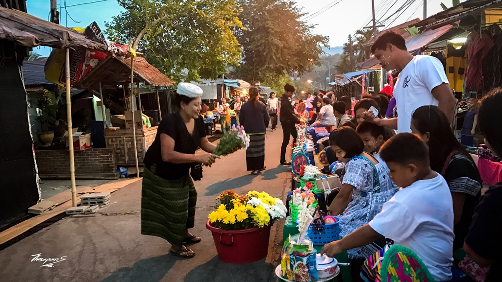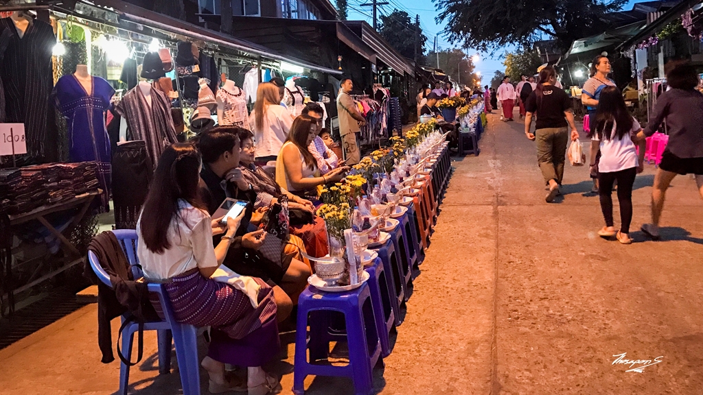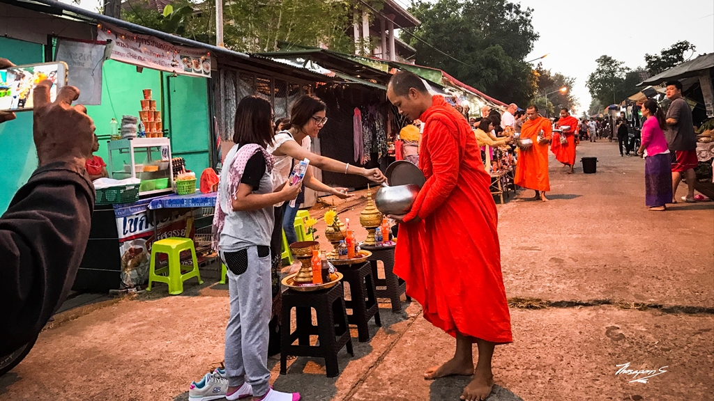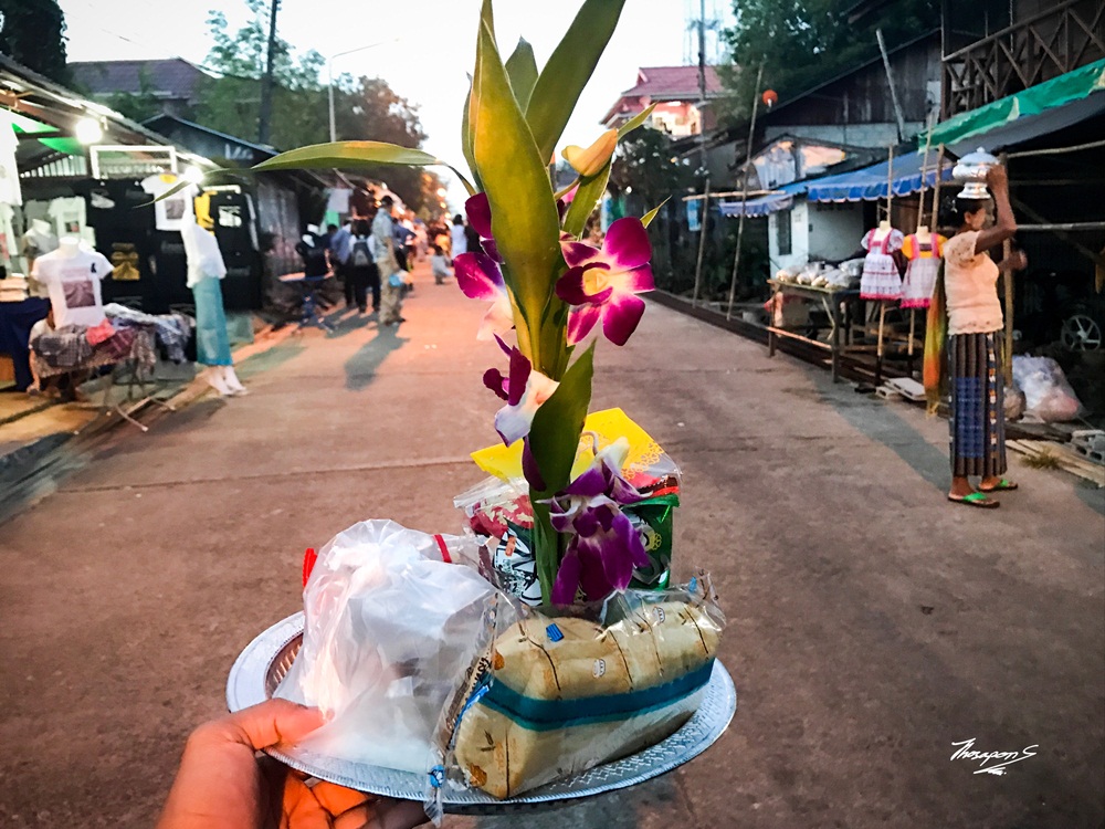 แล้วก็มีพวกไกด์เดินผ่านมา บอกว่าพระไม่เดินมากลางสะพาน ผมก็เลยเดินไปฝั่งมอญ คนเริ่มมาเยอะละครับ เดินไปเรื่อยๆแทบจะต้นทางที่พระบิณฑบาตร ผมก็ซื้อของใส่บาตรตรงนั้นเลย มีเก้าอี้ให้นั่งด้วย พอพระมาก็รีบใส่เลยครับ ชุดใส่บาตรชุดหนึ่งประมาณ 100 บาท ใส่เสร็จก็เดินมาถ่ายรูปชาวบ้านเขาล่ะครับ เก็บภาพสวยๆสักหน่อย