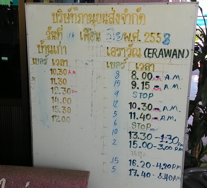ผมวางแผนไว้ว่าจะไปที่ไหนบ้าง แต่ไม่ได้คิดว่าจะไปไหนก่อนหรือหลังดี ปัญหาใหญ่เลยคราวนี้ เดินดูไปเรื่อยก็เจอตารางเดินรถที่จะไปน้ำตกเอราวัณ เอาวะ!! ไปเอราวัณก่อนก็ได้