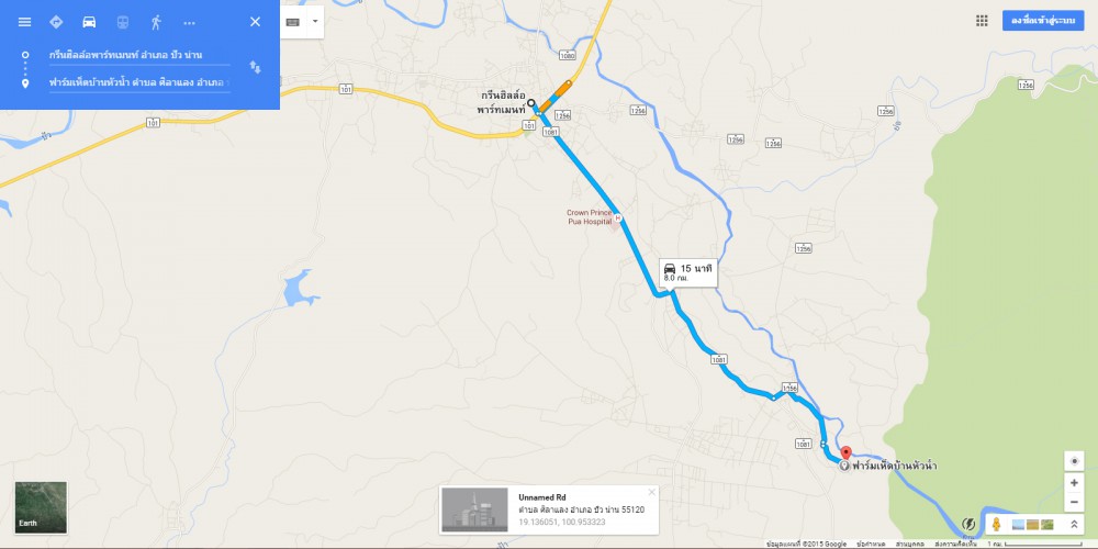 เดินทางจากตัวเมืองน่าน ด้วยถนนเส้น 101 ถึงอำเภอปัว ระยะทางประมาณ 78 กม. เข้าพักที่ กรีนฮิลล์รีสอร์ท ปัว เก็บข้าวของ แล้วออกไปหาข้าวเย็นทานที่ ฟาร์มเห็ดบ้านหัวน้ำ ปัว