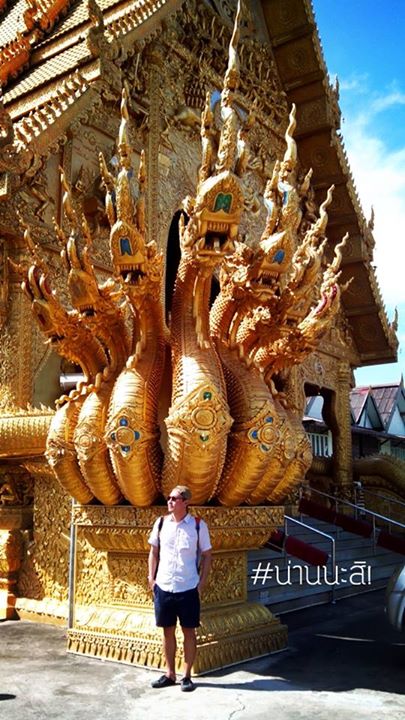 บริเวณด้านหน้า ทีจิตรกรรมปูนปั้น พญานาคเจ็ดเศียร ขนาดใหญ่ ที่มีสวยงาม เฝ้าบันได หน้าวิหารวัด สีทองเหลืองอร่ามเช่นกันครับ (ขนาดใหญ่แค่ไหนเทียบกับตัวผมที่สูง 184 เซนติเมตรดูครับ ขนาดใหญ่โตมาก!)