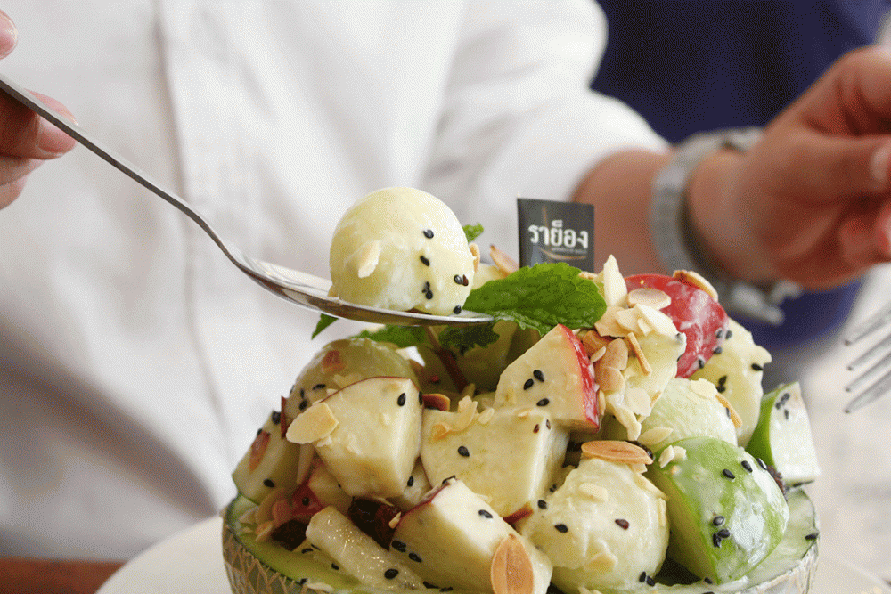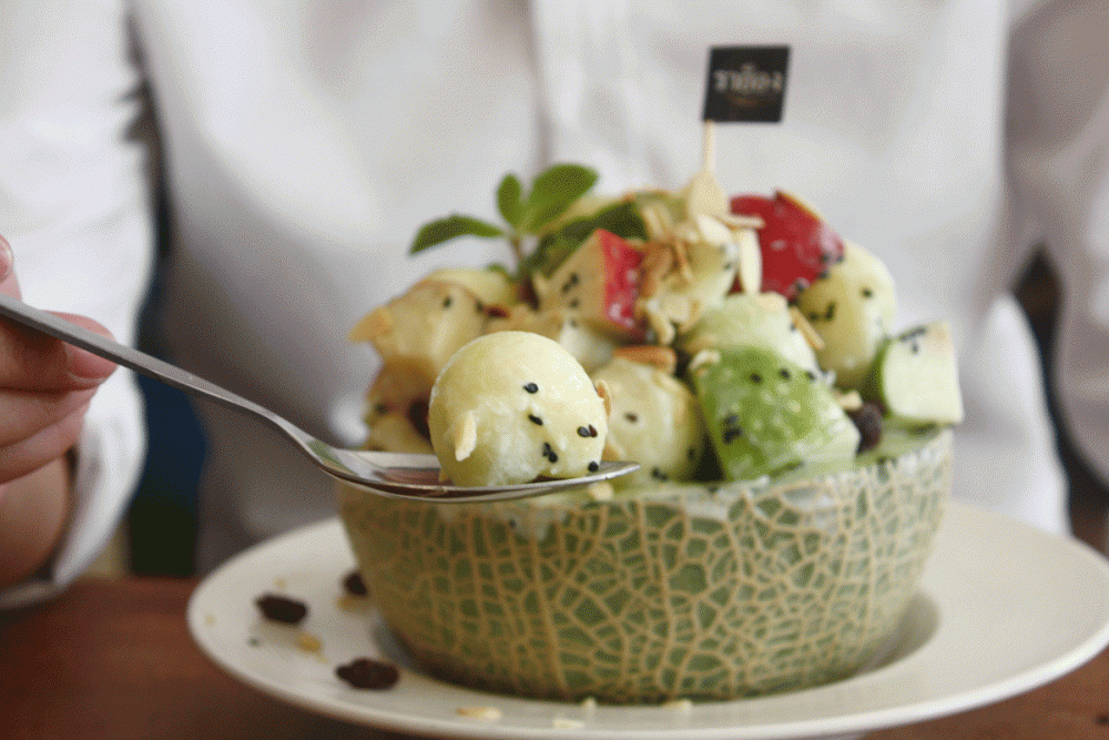 มาถึงเมนูเบาๆกันบ้าง ‘สลัดเมล่อน’ เสิร์ฟมาแบบครึ่งลูกเลย