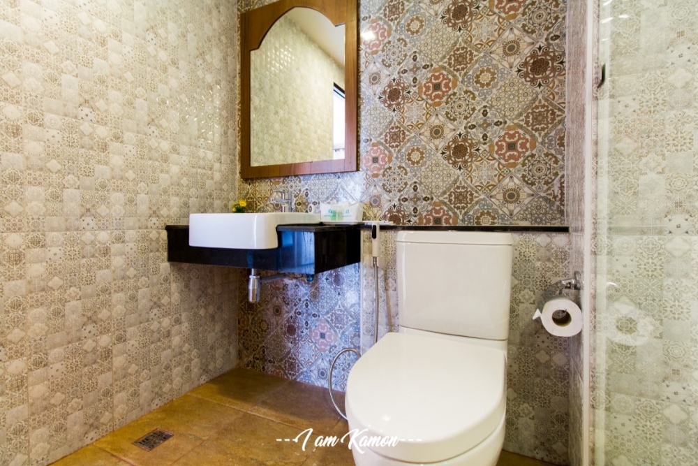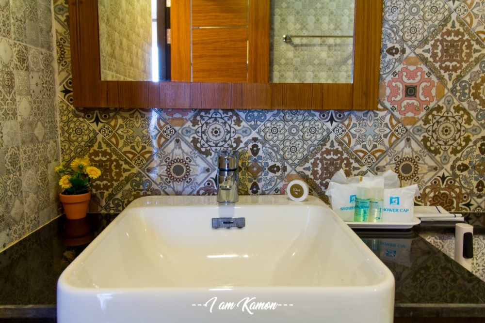 ในห้องจะมีอ่างล้างมือเล็กๆ ไว้ให้ มีกระจก มีตู้เก็บของเหนืออ่างล้างมือ