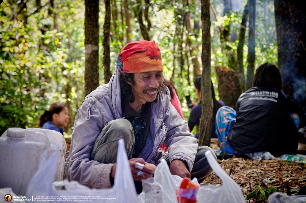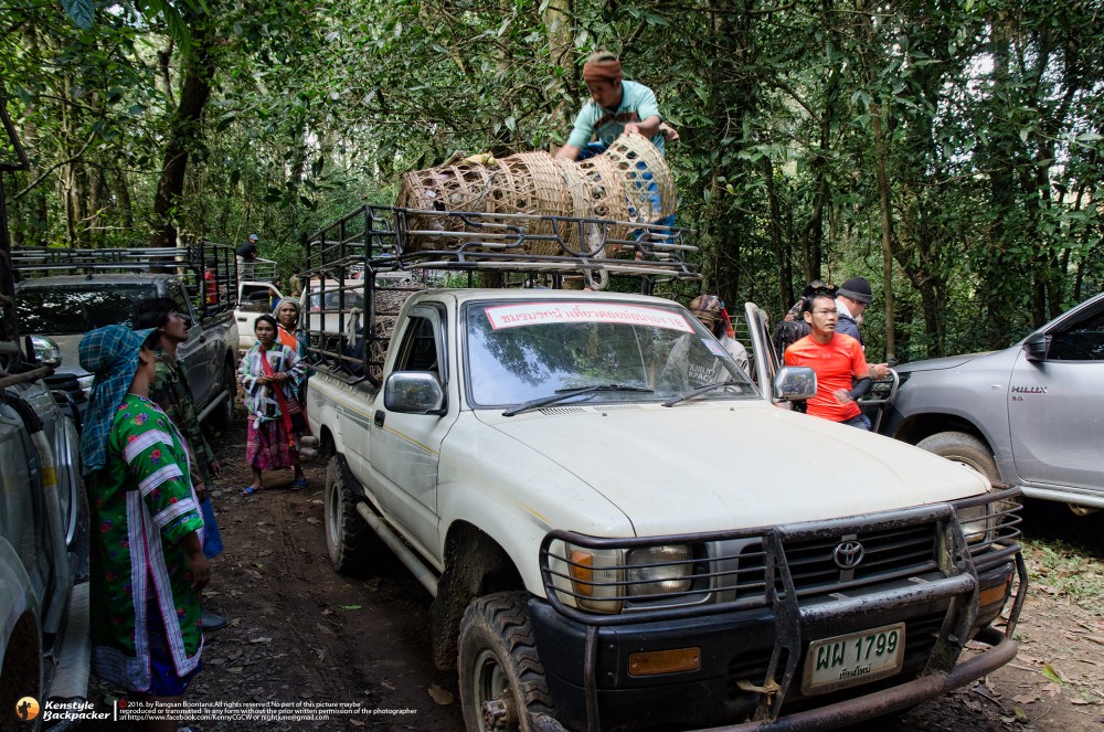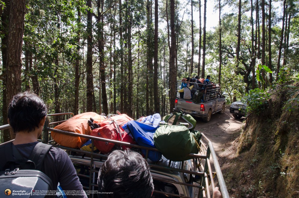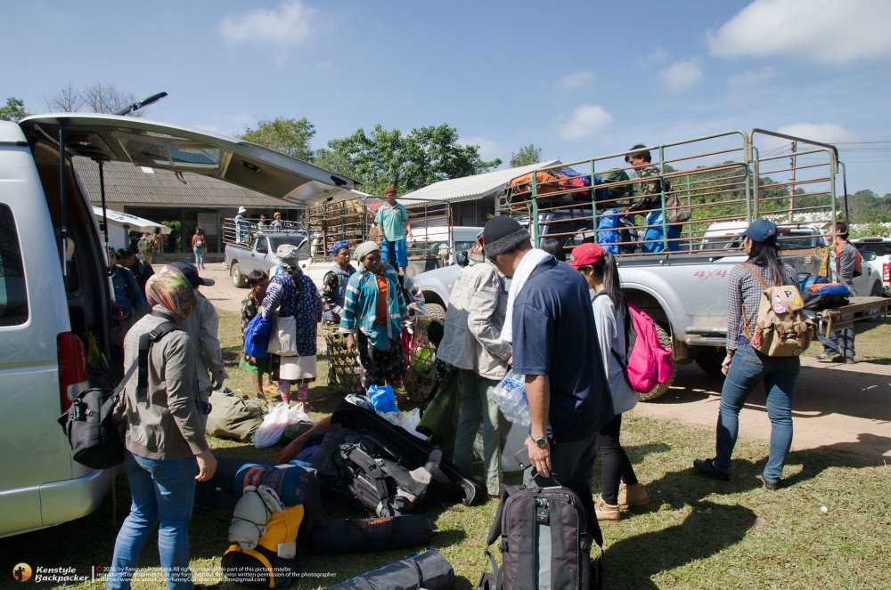 ...ผมเลือกใช้บริการเดินป่ากับกลุ่ม พี่กัณฑ์ คนแบกเป้ เจ้าเก่าเพราะขี้เกียจรวบรวมหาสมาชิกไปกันเอง เพราะไหนจะเรื่องเวลาที่ตรงกัน และความวุ่นวายต่างๆ ที่ทำให้ทริปล่มมาหลายครั้ง ผมก็เลยมักเดินทางไปแจมกับกลุ่มต่างๆที่มีเป้าหมายเดียวกัน เรารวมตัวกันที่ big c สะพานควายนั่งรถตู้ไปกัน 2 คันแวะที่ อ.อมก๋อยหาข้าวเช้ารองท้อง และซื้อเสบียงสำหรับหุงหาอาหาร เสร็จแล้วเดินทางต่อไปยัง หน่วยบริการนักท่องเที่ยวดอยม่อนจอง ชุมชนบ้านมูเซอปากทางซึ่งเป็นศูนย์รวมในการจัดการนำนักท่องเที่ยวขึ้นดอย ต้องไปติดต่อที่นี่ก่อน จัดแจงหาลูกหาบ และติดต่อรถ 4 wd เพื่อบรรทุกพวกเราไปยังจุดเริ่มเดิน รวมแล้วใช้เวลาจากกทมไปถึงจุดเริ่มเดินก็ 14 ชม.กว่าจะได้เดินก็บ่ายโมงครึ่งเข้าไปแล้ว ซึ่งวันที่ไปตรงกับช่วงหยุดยาวรัฐธรรมนูญซึ่งคราคร่ำไปด้วยจำนวนนักท่องเที่ยวที่ค่อนข้างเยอะเป็นพิเศษ