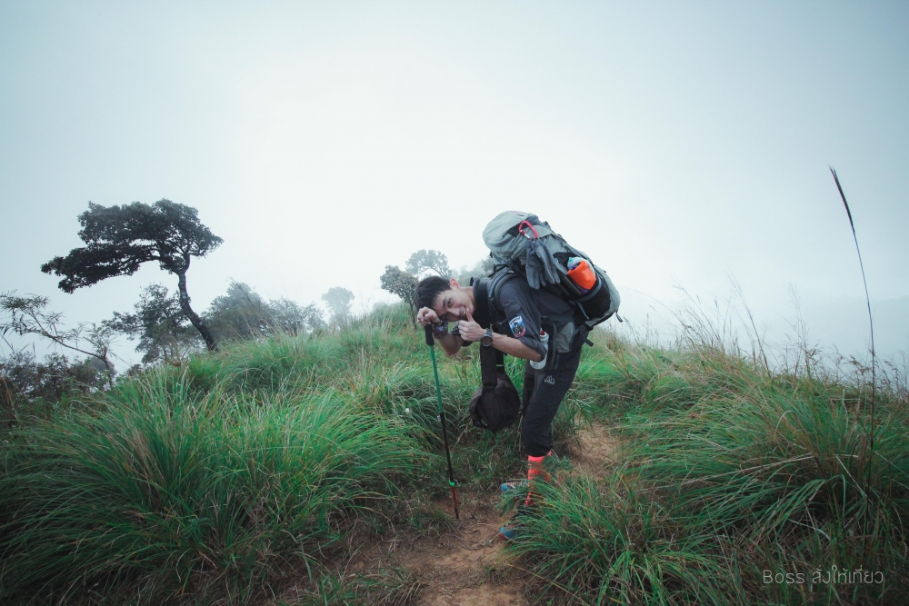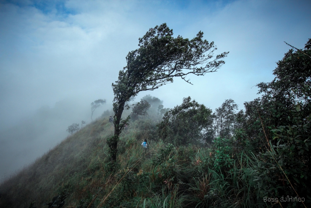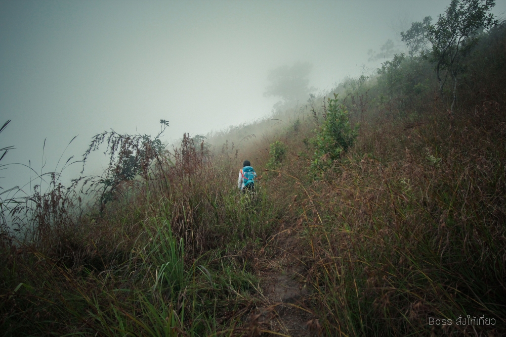 จากตรงนี้ไปจะค่อนข้างชันและเป็นสันเขา วิวสองข้างทางจากตอนที่ได้คุยกับพี่ๆ เค้าบอกว่าสวยมาก แต่วันที่พวกเราไปก็อย่างที่เห็นในรูป ซ้ายก็เทา ขวาก็เทา ไม่เห็นอะไรเลยนอกจากหมอก 5555 วิวไม่เห็นงั้นก็ก้มหน้าก้มตาเดินต่อกันดีกว่า