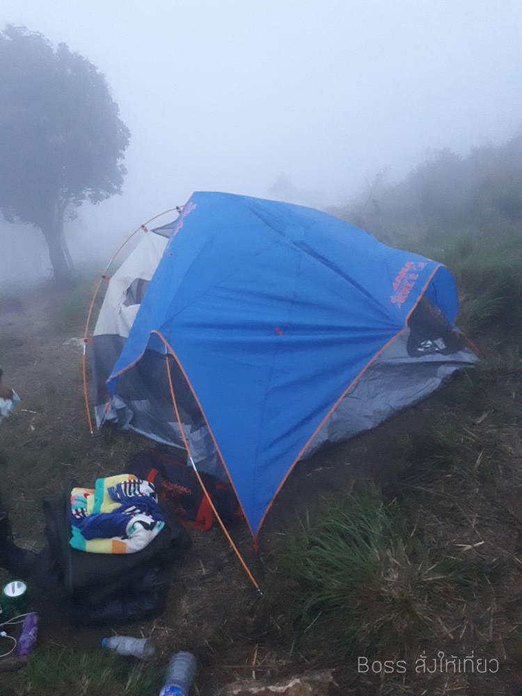 ทั้งๆ ที่ช่วงหัวค่ำนี่ไม่มีที่ท่าว่าจะรุนแรงขนาดนี้ พี่เจ้าหน้าที่ก็คอยมาช่วยดูแล มาเช็คเต๊นท์ จำได้ว่าคืนนั้นสมอบกก็เอาไม่อยู่ พี่เจ้าหน้าที่ช่วยตอกอยู่ สองสามรอบ ส่วนผมเองก็ออกมาตอกสองรอบ จนเวลาประมาณ ตี 2 หน่อยๆ ฝนตก T T นี่เลือกเดือน เลือกวันแล้วนะเนี่ย ฝนมาจากไหนกันหละ เจอทั้งฝนทั้งน้ำค้าง แต่ฝนก็ตกเพียงไม่นานก็หยุด แต่ลมเจ้ากรรม ก็ยังซัดมาอย่างรุนแรงเหมือนเดิม จนในที่สุดเต๊นท์ขาดจ้า เสียงดังปึ้ก พอเปิดประตูเต๊นท์ไปดู คิดในใจช่างแมร่งละ นอนมันงี้แหละเอาถุงนอนคลุมทั้งตัวรวมถึงหน้าด้วย และเคราะห์ซ้ำกรรมซัด ประมาณตี 3 ฝนตกลงมาอีก และมันหนักกว่ารอบแรง ไม่ต้องถามเลย เต๊นท์ขาด ฝนตก น้ำก็เข้าเต็นท์จ้านอนแช่น้ำ เลี้ยงปลากันในเต๊นท์ดีกว่า หลับๆ ตื่นๆ สลับกันไป จนกระทั่งเช้าวันรุ่งขึ้น