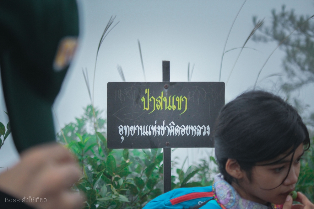 พอเดินมาซักพักเราจะมาเจอกับป้ายป่าสนเขา เป็น Checkpoint แรกของพวกเรานั่งพักและถ่ายรูปเล่นกันสักครู่ก็แบกเป้เดินกันต่อ มุ่งหน้าสู่ดอยหลวง ซึ่งหลังจากนี้เราจะต้องเดินขึ้นๆ ลงๆ ผ่านเขาสี่ลูกหลักๆ คือ