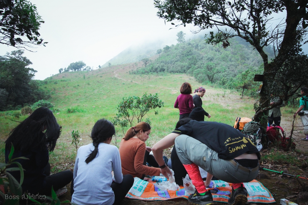 พวกเราก็ออกมาดูสภาพความเสียหาย และทำอาหารเช้ากันเพื่อเตรียมแรงไปกันต่อ แพลนวันนี้ตอนแรกจะไปต่อดอยหนอกแต่ทางพี่เจ้าหน้าที่และพี่ลูกหาบบอกว่าเมื่อคืนฝนตก และสภาพอากาศปิดแบบนี้ เดินยากแถมไปแล้วก็ฟ้าเทาๆ แบบนี้เหนื่อยฟรีนะพวกเราเลยปรึกษากันว่างั้นเราตัดลงอีกทางเลยดีกว่า อย่าเหนื่อยฟรีแล้วไปยืนถ่ายรูปเหมือนอยู่ในสตูดิโอเลย 5555เราเลยต้องเปลี่ยนแพลนจากตอนแรกจะไปดอยหนอกแล้วลงทางน้ำตกเกร็ดนาค เราเลยเดินเส้นทางดอยหลวงแล้วหักลงขวา ไปทางน้ำตกสามโชค อ่างเก็บน้ำห้วยตุ่น แทนซึ่งระยะทางสั้นกว่า พอวางแผนเสร็จแล้วก็เก็บข้าวของเพื่อเตรียมตัวลงกัน