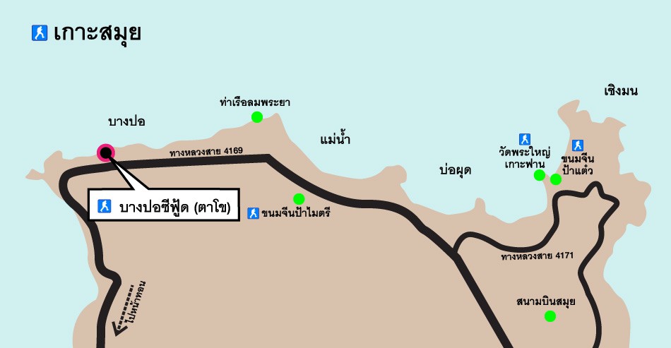 จากบริเวณท่าเรือหน้าทอน มุ่งหน้าไปทางตำบลแม่น้ำ โดยใช้ถนนรอบเกาะ (ทางหลวงหมายเลข 4169) เมื่อมาถึงบริเวณชายหาดบางปอ จะเห็นร้านบางปอซีฟู้ด (ตาโข) อยู่ทางด้านซ้ายมือ