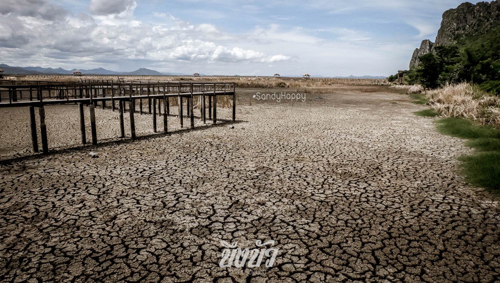 ภาพบึงบัวในเดือนที่แล้ว อย่าว่าแต่เจอบัวเลย ต้นกกก็ยืนต้นตายเหลืองเป็นแถบๆ พื้นที่ๆเคยเป็นน้ำ เป็นทุ่ง เหลือแต่ดินที่แตกระแหงเป็นบริเวณกว้าง