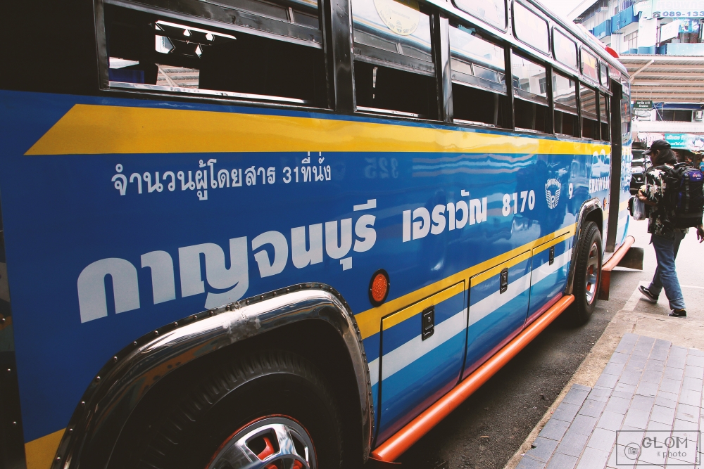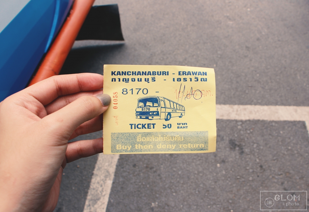 ต่อไปถึงเวลาที่เราทั้งคู่ จะออกตามหารถไปลง แยกโป่งปัดกันค่ะ เราก็ถามคนแถวนั้นว่าต้องไปขึ้นตรงไหน ก่อนจะมาเที่ยว เราก็หาข้อมูลมาล่วงหน้าก่อนหน้านี้แล้วค่ะว่า ถ้าไปบ้านกกกอดต้องลง “แยกโป่งปัด” แล้วต้องไปขึ้นรถประจำทางคันสีน้ำเงิน ที่เขียนข้างรถว่า กาญจนบุรี – เอราวัณ พอเราเจอรถคันสีน้ำเงินละ เราก็ไปซื้อตั๋วที่โต๊ะข้างหน้ารถค่ะ บอกป้าคนขายตั๋วรถว่า ไปลง แยกโป่งปัด เสียค่ารถคนละ 40 บาท ( แต่ถ้าใครจะไปน้ำตกเอราวัณ จะเสียคนละ 50 บาทค่ะ )