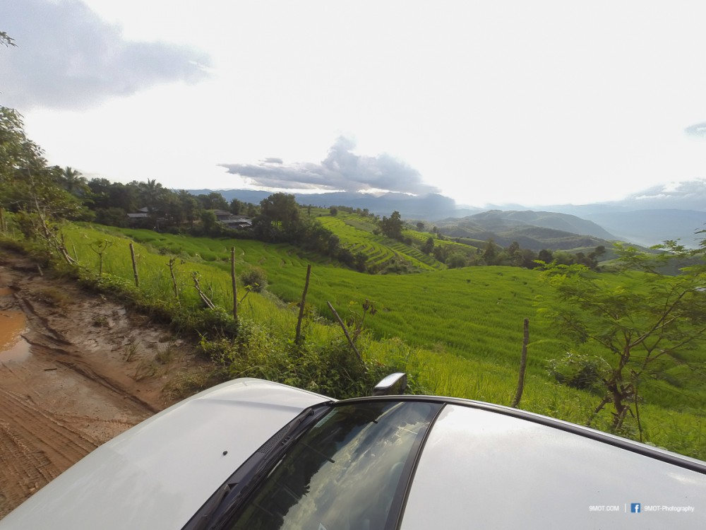 ยังไม่จบภารกิจครับ ผมขับเลยเข้าไปอีกหน่อย และดูเหมือนว่าเส้นทางจะยิ่งโหดร้ายกว่าเดิม ... ขับไปกลั้นหายใจไปอีกอึดใจใหญ่ ๆ เราก็มาถึงมุมสวยอีกแห่งของนาขั้นบันได จุดนี้เห็นนาข้าวผืนใหญ่อยู่ตรงหน้า มองไปไกล ๆ เป็นเทือกเขาสลับซับซ้อน มีนักท่องเที่ยวเดินกันอยู่หลายกลุ่ม มีเข้ามาสอบถามทักทายเพราะต่างคนต่างก็ไม่แน่ใจว่าถึงหรือยัง 555