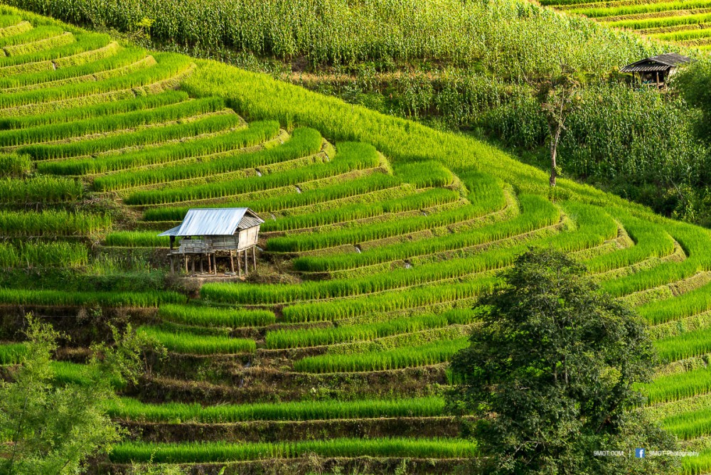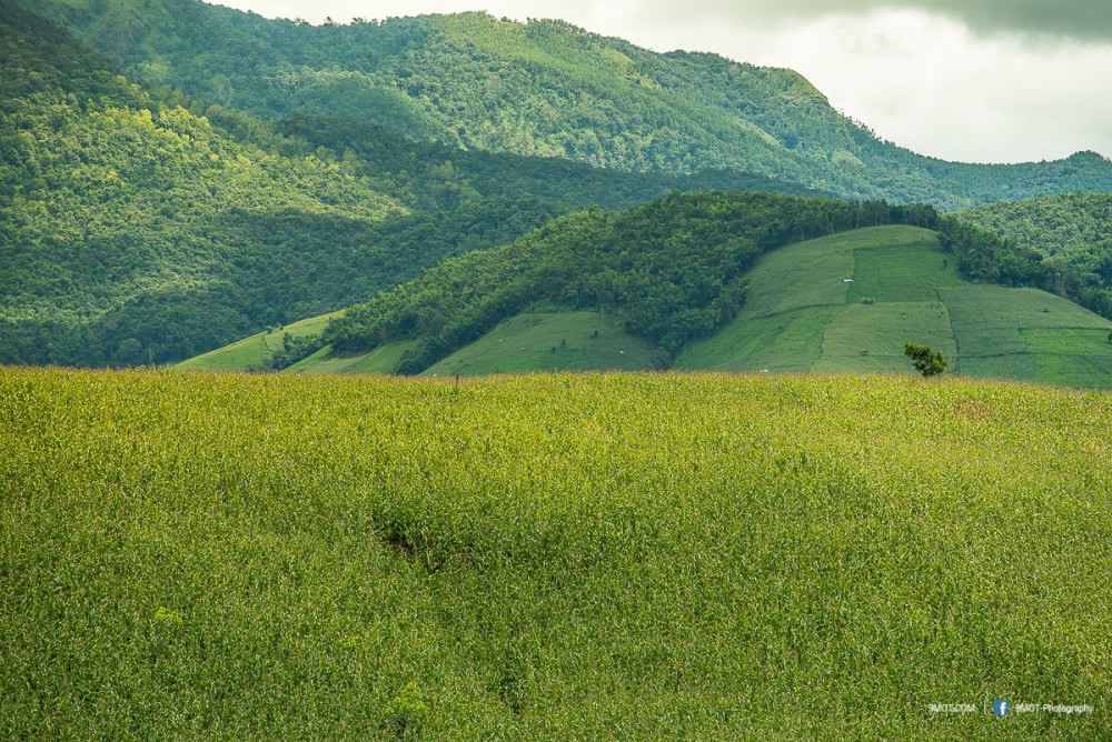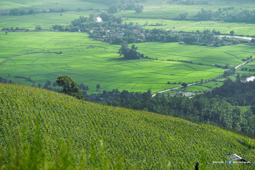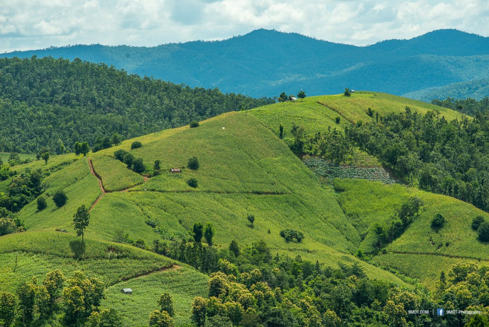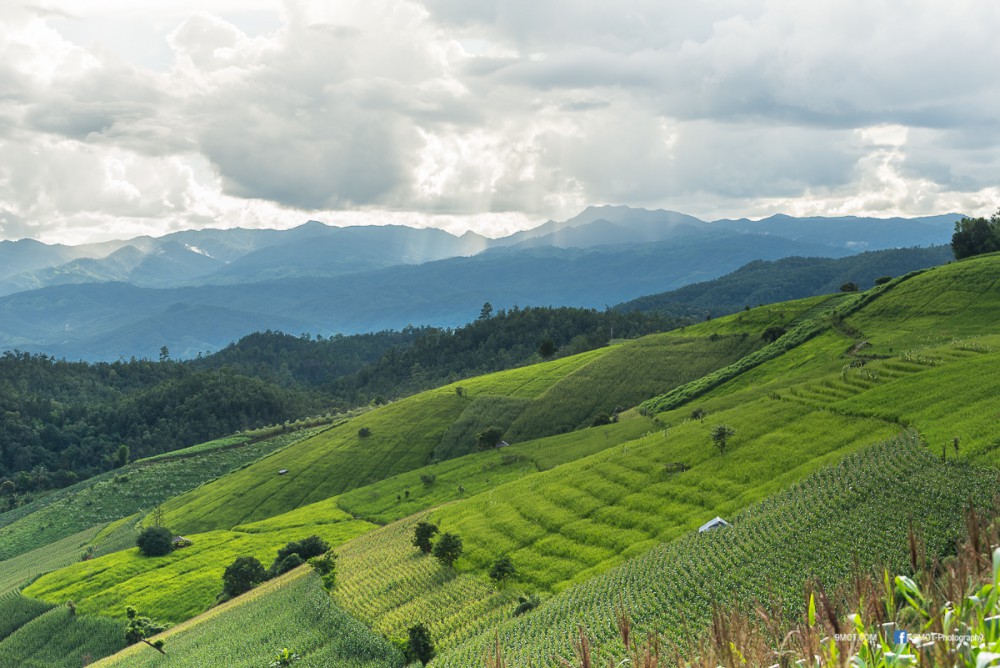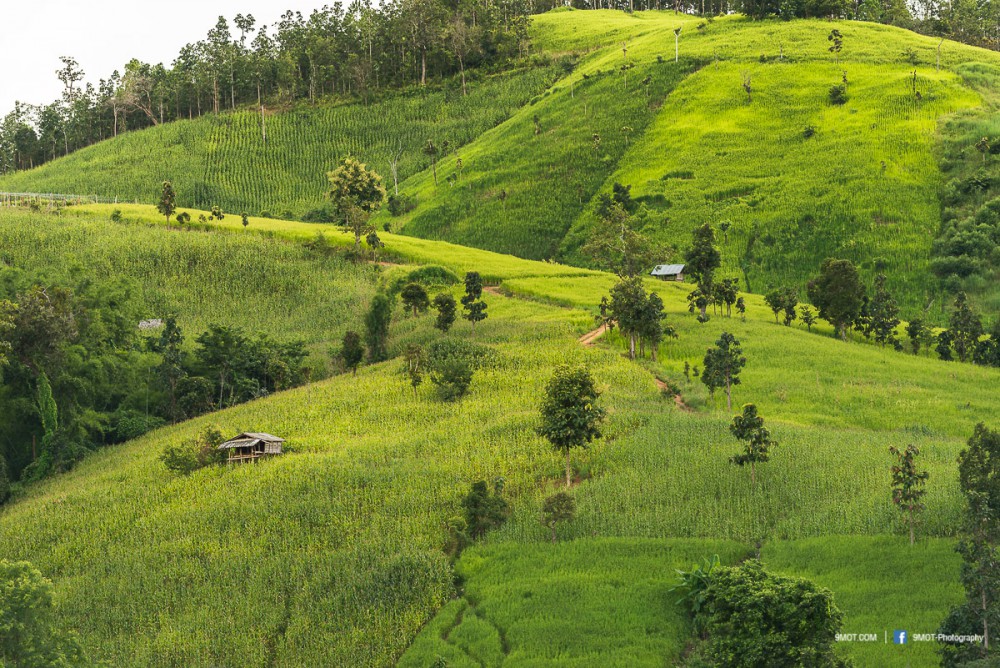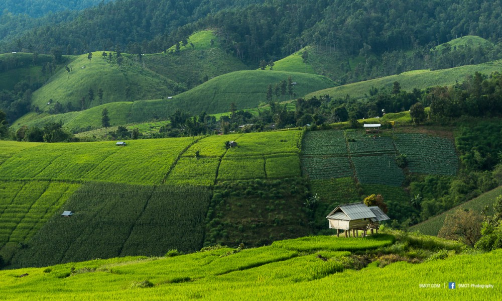 จากจุดนี้มองเห็นภูเขาสลับซับซ้อน ด้านซ้ายเป็นทุ่งนาขั้นบันได ด้านขวาเป็นแปลงปลูกพืชไร่หลากชนิด สีสันและขนาดแปลงที่ต่างกันทำให้เกิดลวดลายที่สวยงามมาก