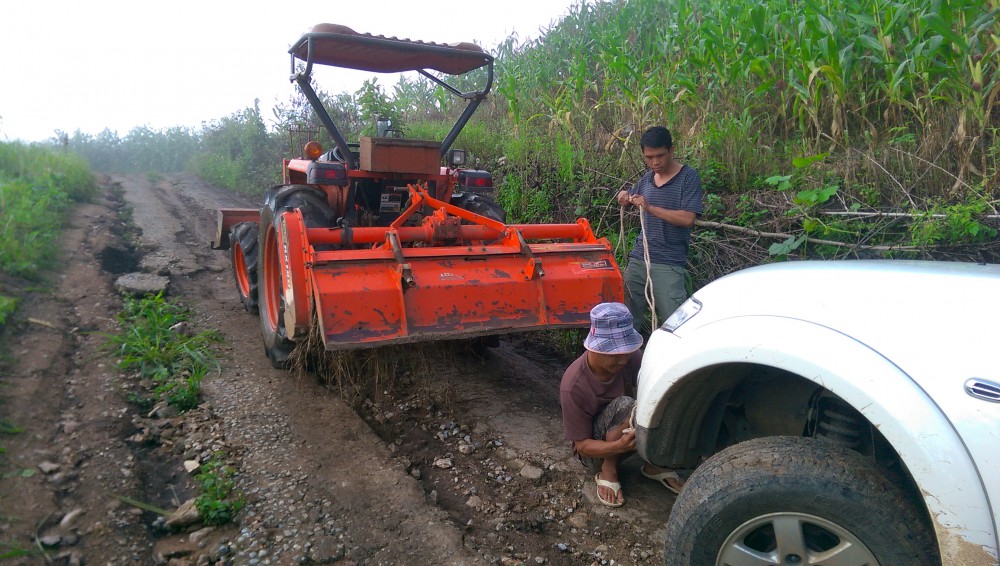 ยังโชคดีที่จุดนั้นพอมีสัญญาณโทรศัพท์ ... ผมตัดสินใจรอคนผ่านไปผ่านมา สักครู่ใหญ่ ๆ มีชาวบ้านขี่มอเตอร์ไซต์ผ่านมา ผมจึงขอความช่วยเหลือ เขาใจดีมากพยายามโทรติดต่อญาติ แต่ติดต่อไม่ได้จึงลงไปตาม จนราวชั่วโมงนึงผ่านไปจึงมีรถไถคันเล็ก ๆ มาช่วยกู้รถผมขึ้นจากหล่มได้ ... งานนี้สอนให้รู้เลยว่า ควรศึกษาเส้นทางให้ดีกว่านี้ และห้ามประมาทเด็ดขาดแม้สภาพรถดี แต่ในบางสถานการณ์ที่เราใช้ไม่ถูกก็อาจเกิดเหตุไม่คาดคิดขึ้นได้ ... นี่ยังดีที่ตกร่องไม่ลึกนักและรถไม่เสียหายอะไร แถมยังมีคนใจดีช่วยเหลือ นึกไม่ออกว่าหากเป็นกลางค่ำกลางคืนในจุดไม่มีสัญญาณจะทำยังไง