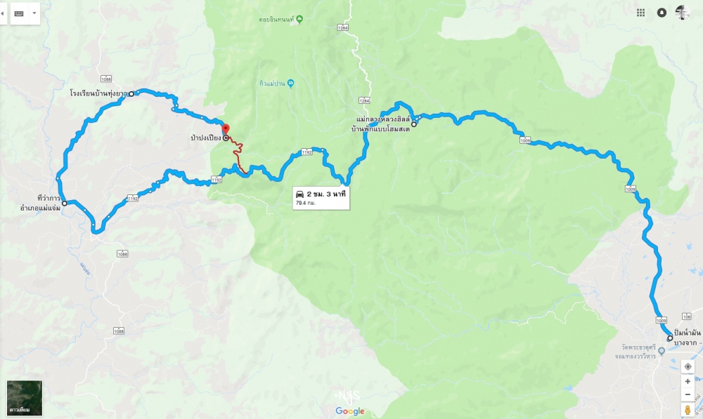 เราเริ่มต้นจากอำเภอจอมทองก่อนที่จะไปบ้านป่าบงเปียงกัน เส้นทางช่วงหน้าฝนเราแนะนำให้ไปทางดอยอินทนนท์ผ่านแม่กลางหลวงแล้วไปทางที่ว่าการอำเภอแม่แจ่ม - โรงเรียนบ้านทุ่งยาว - บ้านป่าบงเปียง หลังจากนั้นทางค่อนข้างเล็กและแคบสวนทางลำบาก มีทั้งทางเรียบและทางขรุขระมีโคลนปะปนกันไป ยิ่งหน้าฝนทางจะค่อนข้างมีน้ำขังทำให้การเดินทางยากลำบากมากขึ้น เส้นสีแดงคือเส้นทางที่ไปบ้านป่าบงเปียงเหมือนกัน แต่หน้าฝนทางนั้นจะค่อนข้างลำบาก ขนาดรถ4X4ยังขึ้นลำบาก ส่วนมากหน้าฝนทางนั้นส่วนใหญ่จะเป็นชาวบ้านที่ใช้เส้นทางนั้น