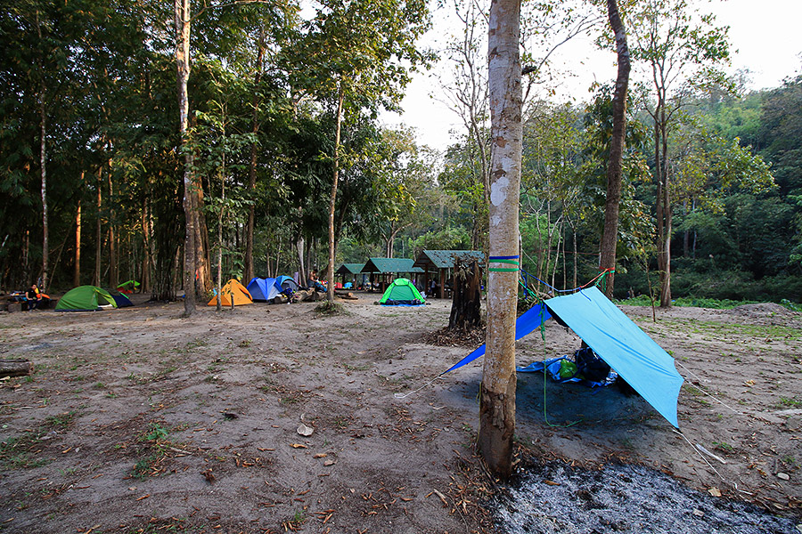 ที่แคมป์แม่กระสาทางอุทยานฯ จัดทำลานกางเต็นท์อย่างดี มีศาลาสามหลังแบ่งกันใช้ ตรงกลางเป็นของเจ้าหน้าที่และลูกหาบ หลังซ้ายกับขวาแบ่งกันหลังละกลุ่ม ห้องน้ำก็มีอย่างดี ใช้เฉพาะสำหรับทำธุระขับถ่ายเท่านั้นนะครับ