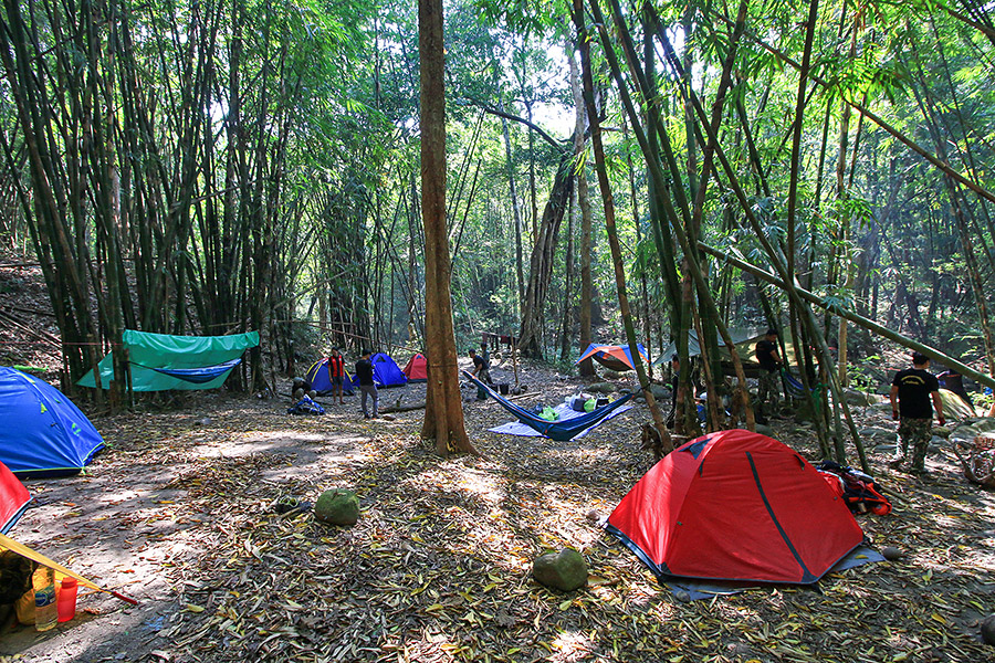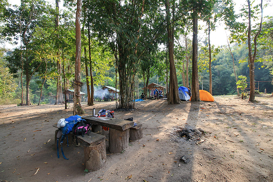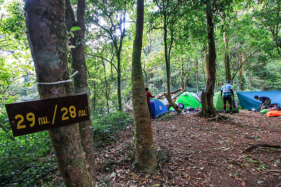 จากจุดนั้นเดินอีกแค่สิบนาทีก็ถึงแคมป์ที่สองริมห้วยแม่เรวา อุทยานฯ ถางพื้นที่สำหรับตั้งแคมป์สบายๆ ให้บางส่วน มีห้องน้ำเพิงไม้ไผ่ให้ด้วย ใครจะปลดทุกข์ก็หยิบถังไปตักน้ำจากลำห้วยมาใช้งาน