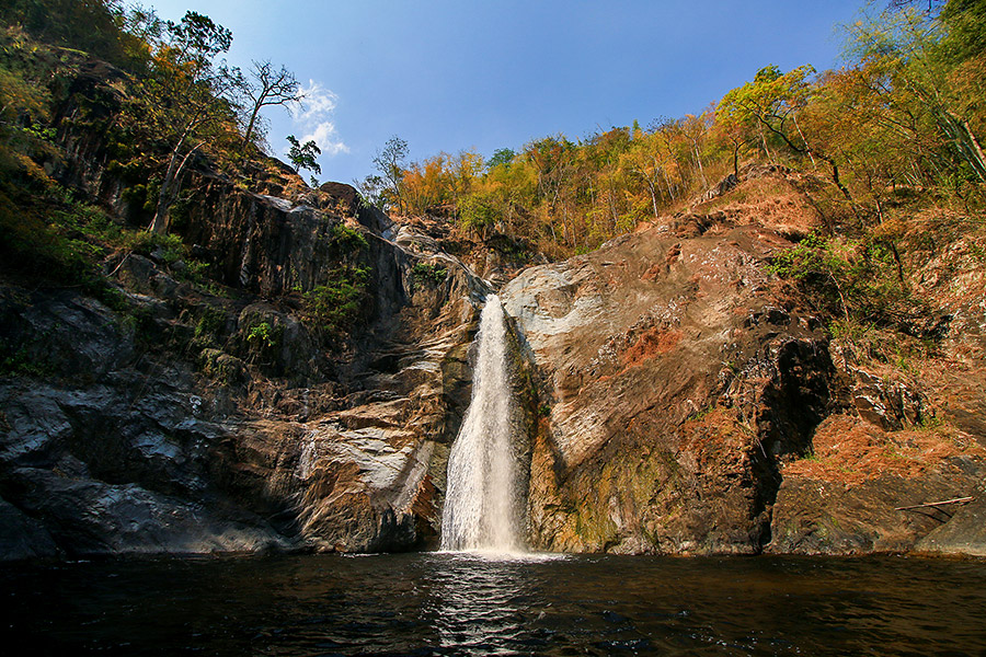 หลังพ้นเนินแรกมาอย่างสะบักสะบอม จากนั้นทางค่อนจะราบ มีเนินสลับอยู่บ้างแต่ไม่ชันมาก เดินเรื่อยๆ ตากแดดเหนื่อยก็พัก มีธารน้ำห้วยมะนาวที่เราต้องข้ามไปข้ามมาหลายรอบ ใครมีเครื่องกรองน้ำพกพาก็ค่อนข้างสบาย เติมน้ำได้ตลอดในช่วงนี้