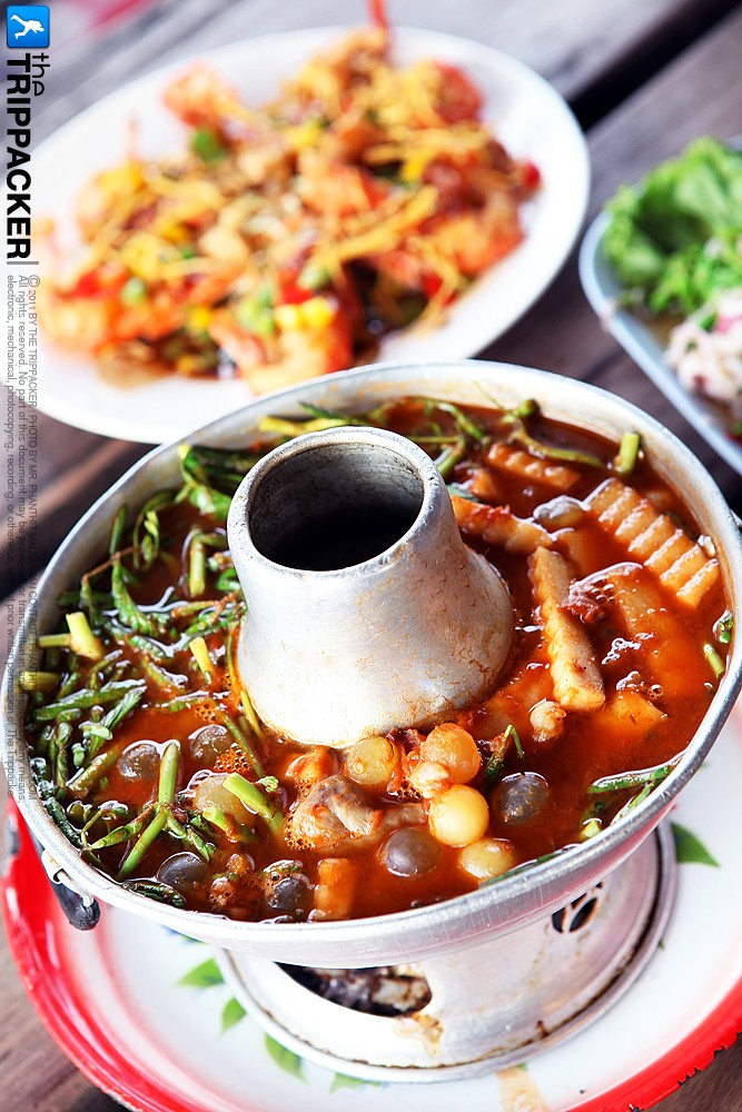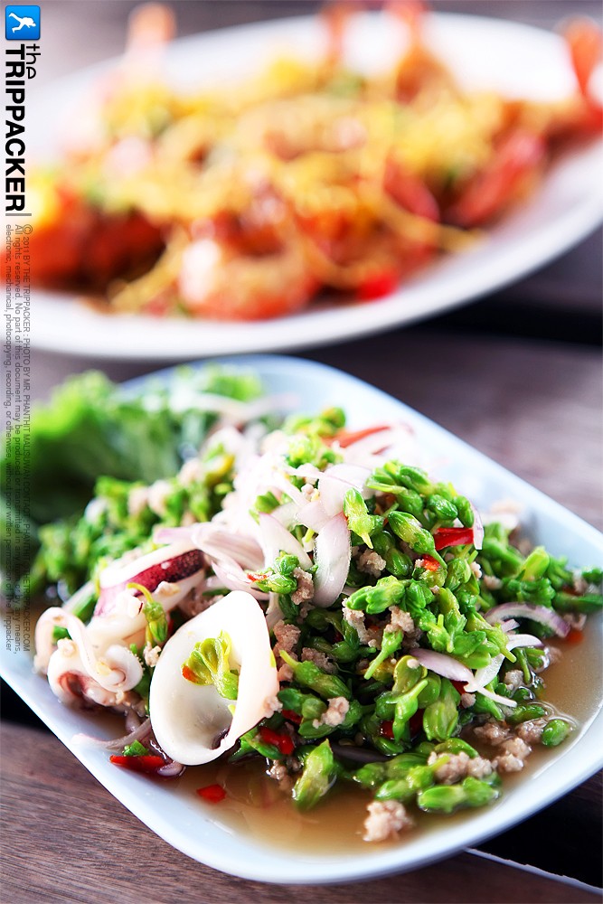 เรามุ่งหน้าสู่จังหวัดฉะเชิงเทรา หรือที่เรามักจะเรียกกันติดปากว่า“เมืองแปดริ้ว” พอเข้าตัวเมืองแล้วเราก็ตรงดิ่งไปเพิ่มพลังให้ตัวเองก่อน เพราะหิ้วท้องรอจนเลยเวลาอาหารมาพอสมควรแล้ว เมื่อถึงร้านก็ไม่ต้องรอช้าจับจองที่นั่งริมแม่น้ำบางปะกงได้ก็จัดแจงสั่งอาหารทันที ขืนรอนานกว่านี้มีหวังคงกินช้างได้ทั้งตัวแน่ๆ และทางร้านก็ไม่ทำให้ผิดหวังเพราะแค่ไม่กี่อึดใจอาหารที่สั่งก็ทยอยมาวางจนเต็มโต๊ะ ขอเรียกน้ำย่อยกันด้วย “ยำดอกขจร” เสียก่อน ดอกขจรสีเขียวสดลวกแล้วนำมายำเข้ากับน้ำยำรสกลมกล่อม พร้อมด้วยปลาหมึกและหมูสับอร่อยเข้ากันกำลังดีไม่มากไม่น้อยไป จัดว่าเป็นจานเรียกน้ำย่อยที่ถูกใจเราเลยล่ะ ส่วนเมนูต่อมาขอซดน้ำแกงร้อนๆ จากหม้อไฟ“แกงส้มไข่ปลาเรียวเซียว” ที่ทั้งเข้มทั้งข้นในเรื่องรสชาติ แถมมีไข่ปลาเรียวเซียวเม็ดกลมๆ ใส่มาแบบไม่มีหวงของ เราเลยได้ซดน้ำแกงส้มไปเคล้ารสมันๆ ของไข่ปลาเรียวเซียวไปด้วย ช่วยให้เจริญอาหารขึ้นเยอะเลย
