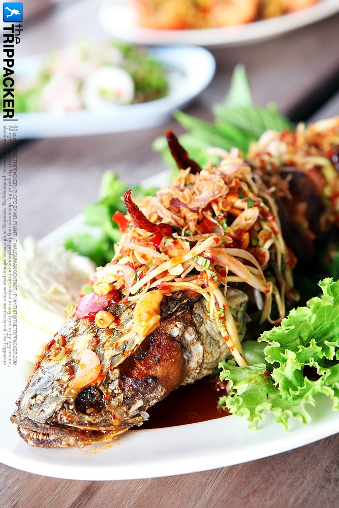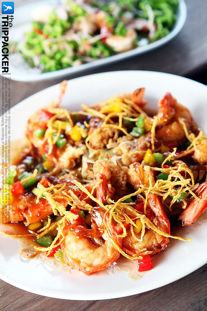 จานต่อมาขอเอาใจเด็กๆ กันบ้างด้วย “กุ้งราดซอสมะขาม” ตัวกุ้งถูกนำมาผ่าครึ่งและทอดมาพร้อมเปลือก จึงทำให้มีกลิ่นหอมก่อนจะราดด้วยซอสมะขามรสเปรี้ยวอมหวาน โรยหน้าปิดท้ายด้วยกระชายทอดกรอบที่ช่วยเพิ่มความหอมให้เมนูนี้ได้ดีทีเดียว รับรองได้เลยว่าทั้งเด็กทั้งผู้ใหญ่คงติดใจเมนูนี้ไปตามๆ กัน ส่วนจานสุดท้ายที่เรานำมาแนะนำกันนั้นคือ “ปลาช่อนเอกเขนก” มาถึงริมแม่น้ำทั้งที จะไม่มีเมนูปลาก็คงจะไม่ได้ แถมเมนูนี้ยังมีชื่อร้านกำกับด้วยจึงเชื่อได้ว่าเป็นสูตรเด็ดเฉพาะของทางร้านแน่นอน ตัวปลาช่อนนั้นถูกทอดจนกรอบนอกนุ่มใน แล้วนำมาวางนอนเอกเขนกบนจาน ก่อนจะราดด้วยน้ำยำสูตรเด็ด ที่ให้รสชาติกลมกล่อม หอมมันด้วยถั่วลิสง และเม็ดมะม่วงหิมพาน แถมด้วยเครื่องสมุนไพรนานาชนิด และมะม่วงซอยที่ช่วยเพิ่มรสชาติอร่อยเข้าไปอีก แค่เมนูแนะนำที่เราสั่งในครั้งนี้ก็ทำเอาเราก้มหน้าก้มตากินกันจนแทบจะไม่ได้คุยกันเลย ทั้งๆ ที่ยังมีอาหารอื่นๆ ที่น่าชิมอีกมากมาย แต่พื้นที่ในกระเพาะดันเต็มเสียก่อน ขืนสั่งมาอีกมีหวังได้เป็นชูชกแน่ๆ