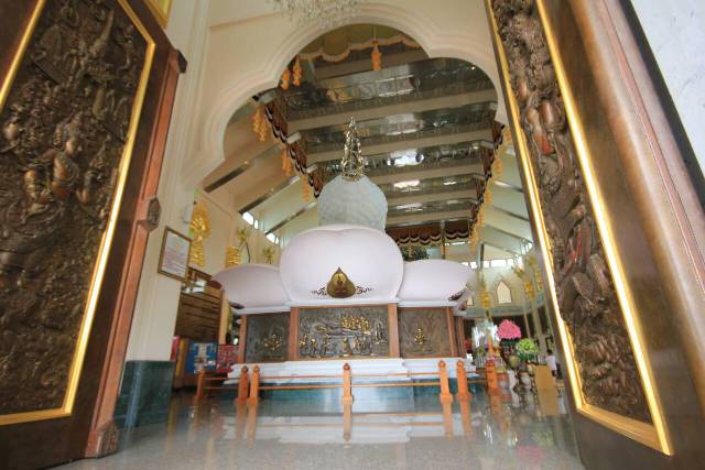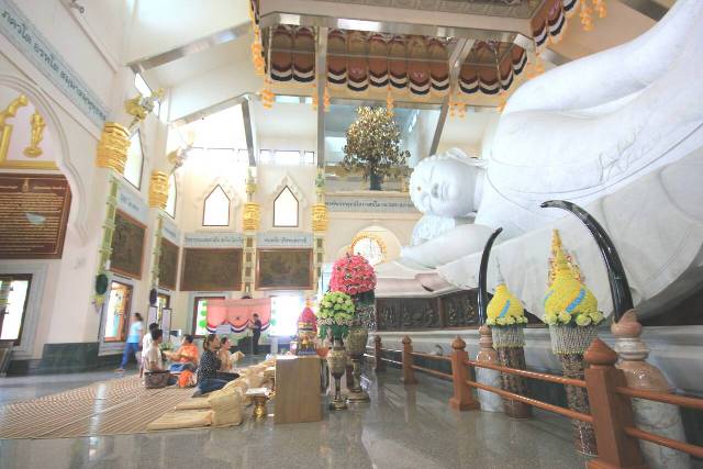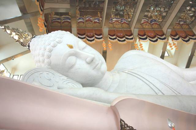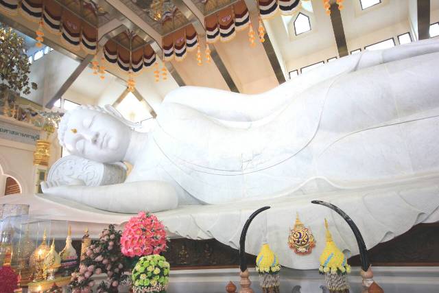 พระพุทธไสยาสน์หินอ่อนขาว มีความยาว 20 เมตร สร้างขึ้นเพื่อหวังให้เป็นเอกลักษณ์ทางพุทธศิลป์แห่งสมัยรัชกาลที่ 9 โดยเฉพาะ โดยได้ความอนุเคราะห์จากท่านอาจารย์นริศ รัตนวิมล ผู้เป็นยอดศิลปินประติมากรหินของไทย เป็นผู้ออกแบบและแกะสลักองค์พระพุทธไสยาสน์ และท่านอาจารย์สมยศ คำแสง เป็นผู้ออกแบบฐานพระพุทธรูปเป็นภาพปั้นนูนต่ำหล่อทองแดงเรื่องราวของพระมหาปรินิพพานสูตร นับเป็นงานก่อสร้างสุดท้ายที่ยิ่งใหญ่ล้ำค่า ประดิษฐานไว้บนยอดภูเขาในพุทธอุทยานมหารุกขปาริชาติภูก้อน มีระยะเวลาการสร้าง 6 ปี ตั้งแต่ปี พ.ศ. 2549-2555 งบประมาณการสร้างรวม 549.9 ล้านบาท  ขอบคุณข้อมูลจากhttp://www.watpaphukon.org/budhasaiyard/
