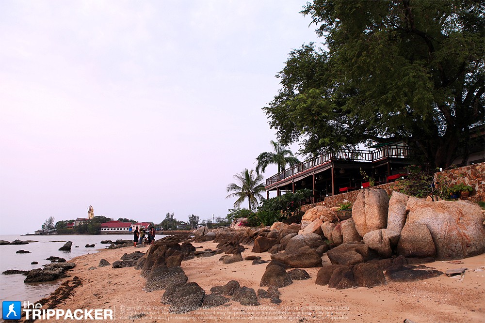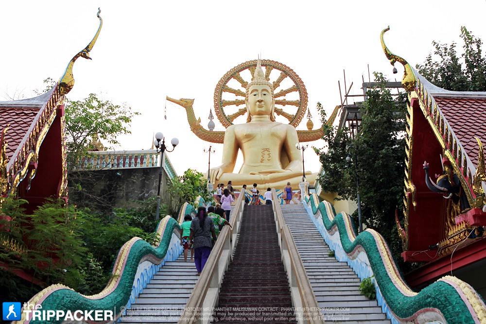 หลังจากที่เราเดินขึ้นบันไดพญานาคไปกว่า 60 ขั้น เราก็มาถึงบริเวณยอดเขาของเกาะฟาน โดยปกติแล้วทางวัดจะไม่อนุญาตให้สวมรองเท้าขึ้นไปบริเวณองค์พระ แต่ในช่วงกลางวันที่มีแดดแรงๆ ซึ่งพื้นกระเบื้องด้านบนจะร้อนมาก ทางวัดก็จะอนุโลมให้สวมรองเท้าขึ้นไปได้ เมื่อได้สักการะขอพรจากองค์พระพุทธโคดมเรียบร้อยแล้ว เราแนะนำให้เดินเล่นชมวิวสวยๆ ของชายหาดบางรักษ์ และถ้าวันไหนอากาศดีๆ เราจะสามารถมองเห็นเกาะพงันจากจุดนี้ได้อย่างชัดเจน ซึ่งจากบริเวณองค์พระนี้เราจะสามารถมองเห็นทิวทัศน์ของเกาะสมุยในมุมสูงได้สวยงามสุดสายตา พออิ่มเอมกับบรรยากาศด้านบนแล้ว เดินลงมาแวะชมบริเวณรอบๆ วัด ซึ่งเป็นศาสนสถาน มีพระพุทธรูปปางต่างๆ เจ้าแม่กวนอิม รวมถึงแผงให้เช่าบูชาพระเครื่อง และวัตถุมงคลต่างๆ ถัดออกมาอีกหน่อยก็จะเป็นร้านขายเสื้อผ้า ของที่ระลึก สินค้าพื้นเมือง รวมถึงอาหารอร่อยๆ มากมายให้เราได้เดินเลือกซื้อเลือกหาไปฝากคนที่บ้านได้อย่างจุใจ