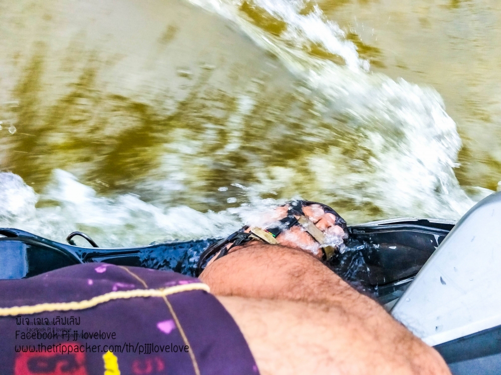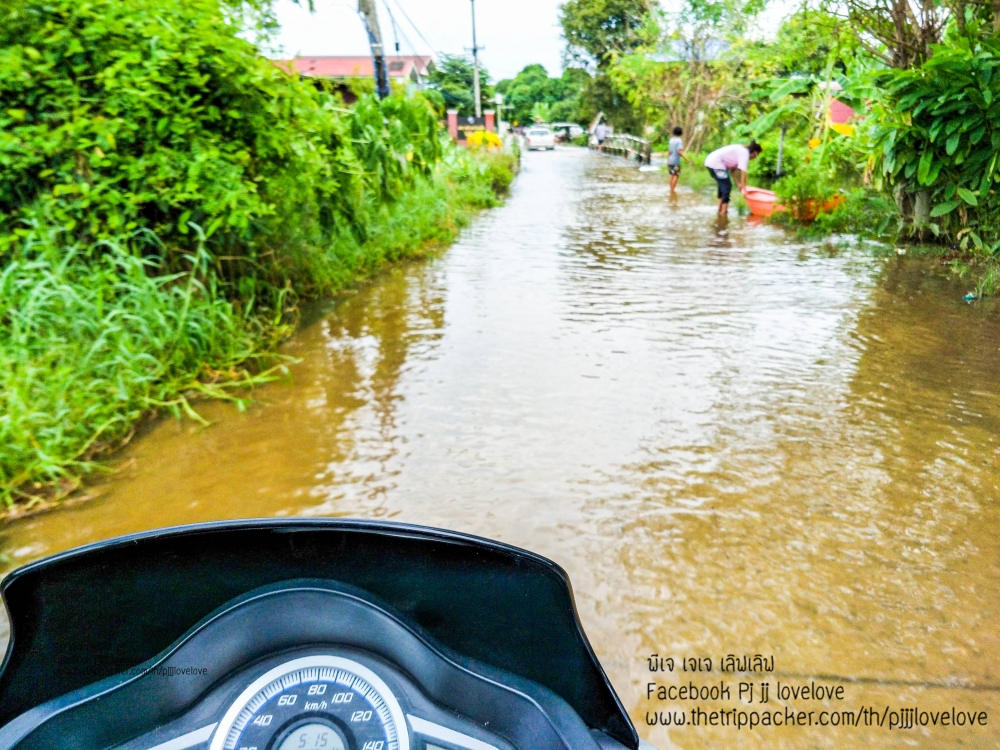 - เข้ามา มือข้างขวาก็ต้องเกร็งแฮนด์มอไซต์ มือซ้ายก็อยากจะถ่ายรูปมาให้ดูกัน ขนาดรถสูงนะเนี้ย ท่วมถึงหลังเท้าเราเลย (เทคติคการขับรถลุยน้ำที่สูงท่วมระดับนึง คือเราต้องบิดเครื่องให้ความเร็วคงที่ อย่าผ่อนเครื่องให้ช้าไปเด็ดขาด ไม่งั้นน้ำจะเข้าท่อไอเสีย ทำให้เครื่องยนต์เสียหาย หรือรถดับไปเลยก็ได้ สำคัญสุด ต้องมั่นใจนะ ว่าทางที่เราไป มันไม่มีหลุม ไม่งั้น จมแน่ ลาก่อนกันเลยแหละ)