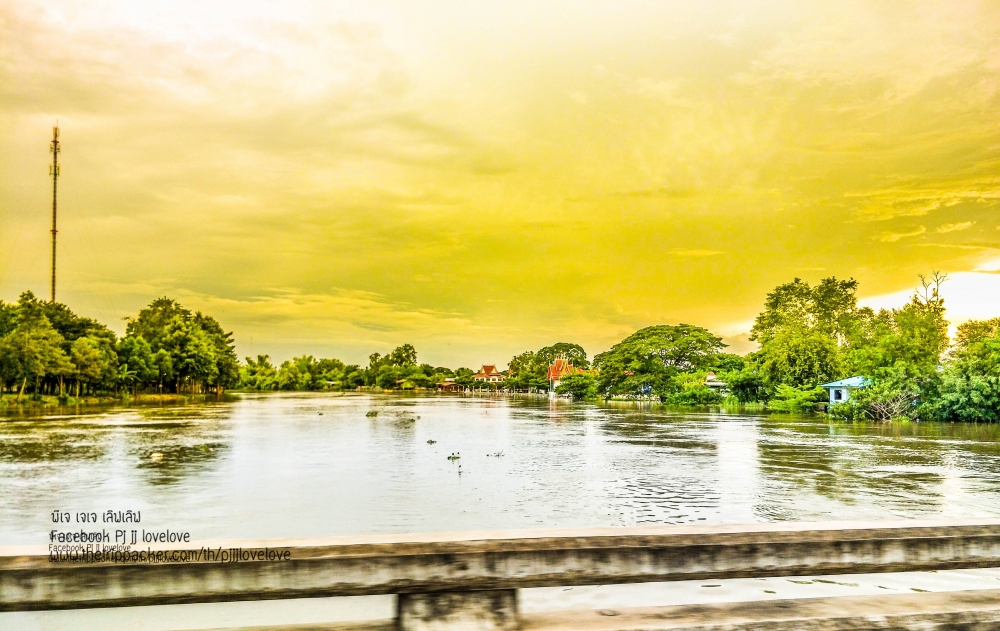- ก่อนข้ามแม่น้ำยม แสงพระอาทิตย์กำลังตกเลย ภาพบรรยากาศ วิถีชีวิตชาวบ้าน ดูแล้วรู้สึกทุกอย่างมันลงตัวสวยงาม - ภาพที่เห็นนั้นคือ น้ำในแม่น้ำยมไหลล้นเออเต็มตลิ่ง ชาวบ้านที่อาศัยอยู่ริมแม่น้ำ ได้ปรับสภาพชีวิตให้เข้าสถานการณ์ที่เกิดขึ้น