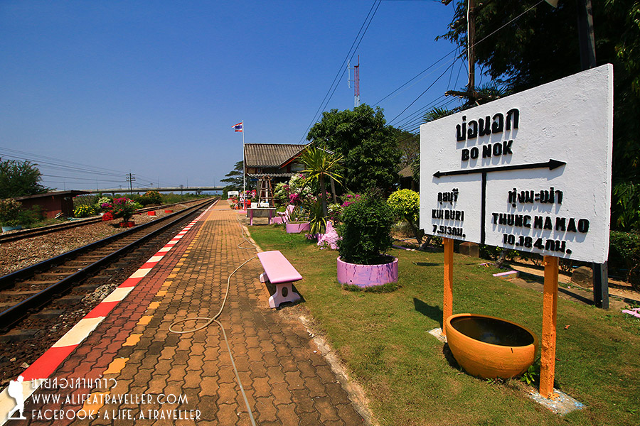 นั่งกินลมชมวิวมาเรื่อยๆ ผ่าน นครปฐม ราชบุรี เพชรบุรี ชะอำ หัวหิน ปราณบุรี สามร้อยยอด พอถึงกุยบุรี ก็เตรียมตัวลง บ่อนอกคือสถานีถัดไป ผมลงรถบ่ายโมงครึ่ง ใช้เวลาหกชั่วโมง เลทจากตารางครึ่งชั่วโมง ถือว่าให้อภัยกันได้ รถของรีสอร์ทและใครคนพิเศษของผมมารอรับอยู่แล้ว